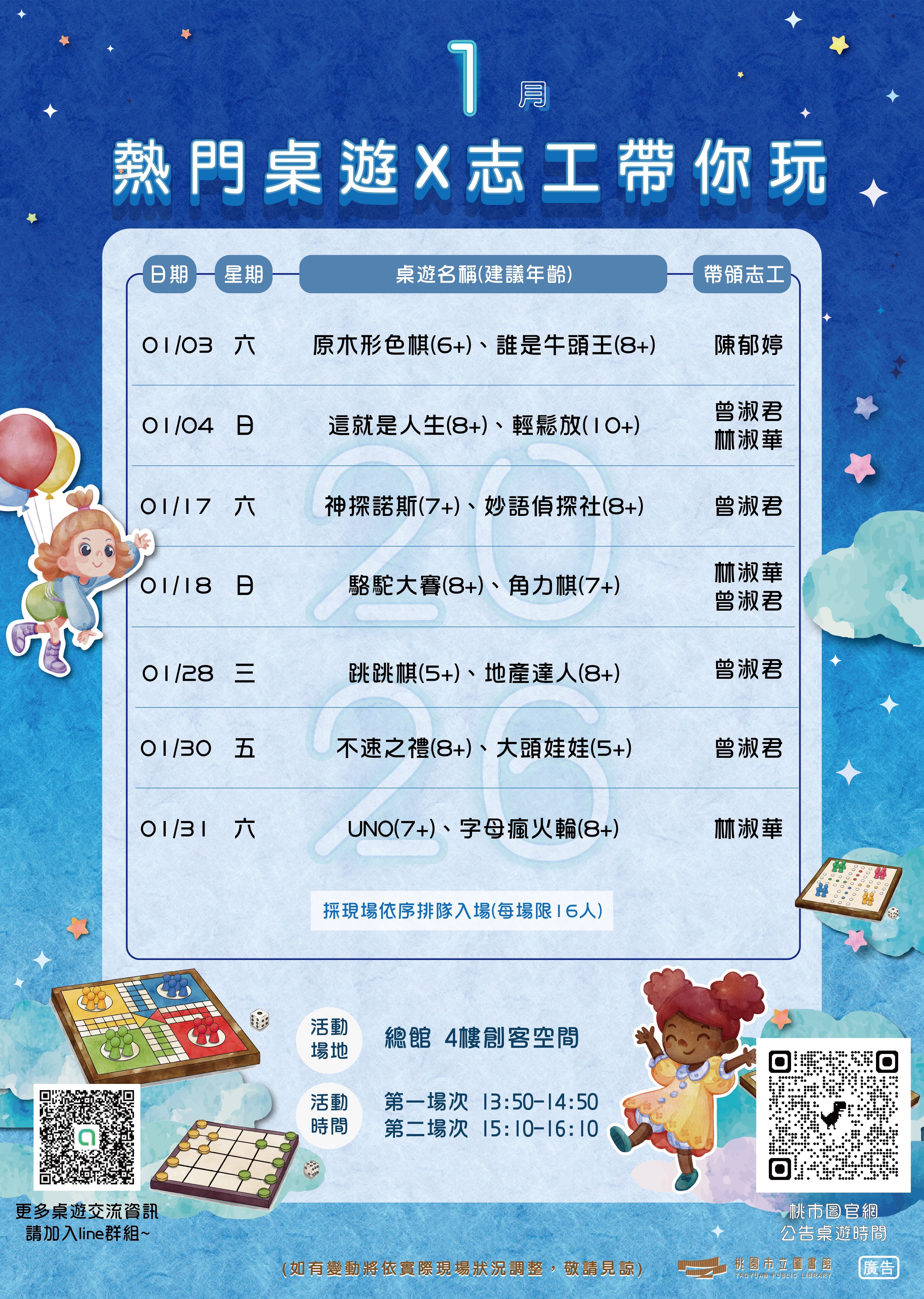 桃園市立圖書館|總館|2026年1月桌遊開放時間(時間如有變動,以官網公告為準)