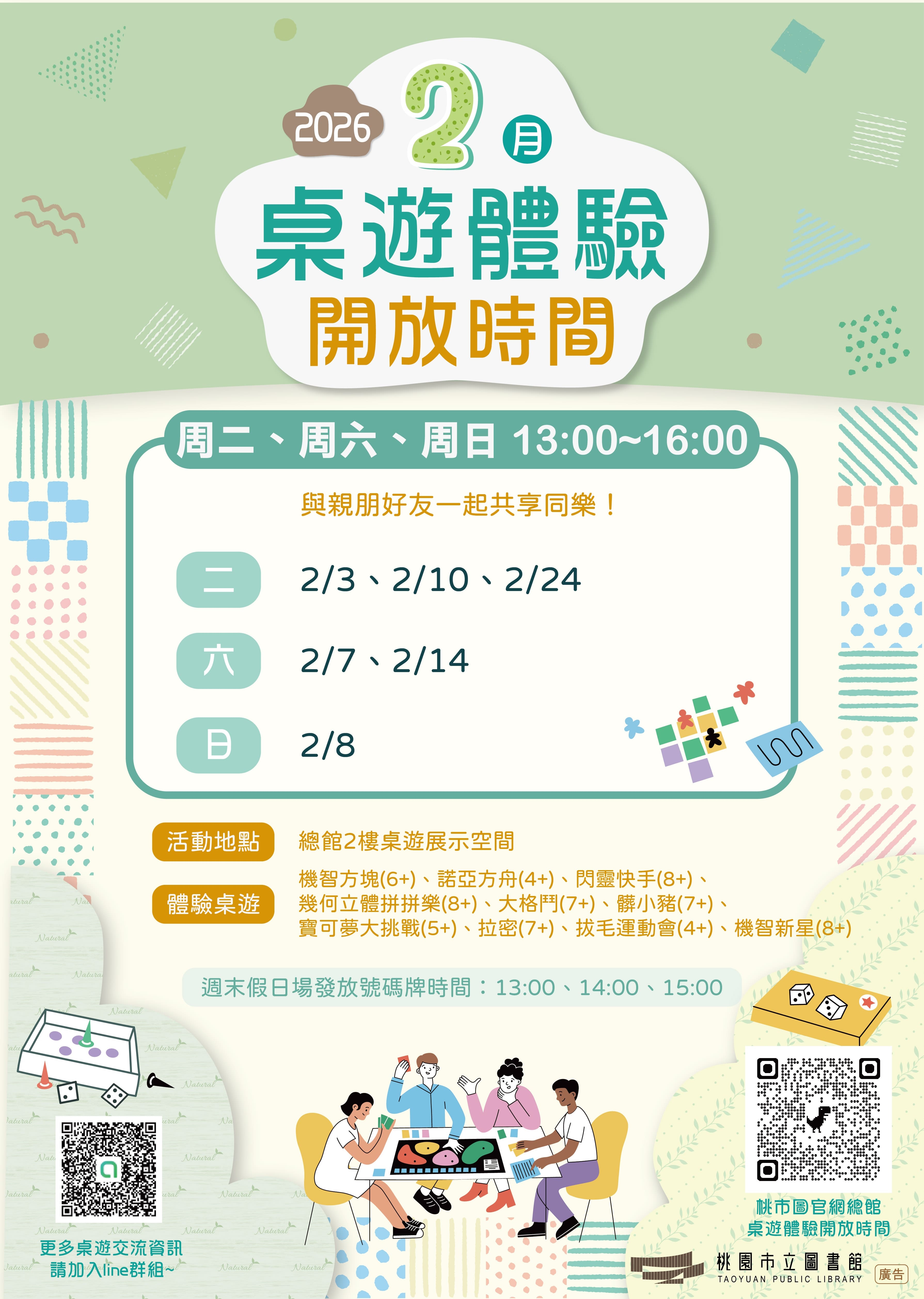 桃園市立圖書館|總館|2026年2月桌遊開放時間(時間如有變動,以官網公告為準)