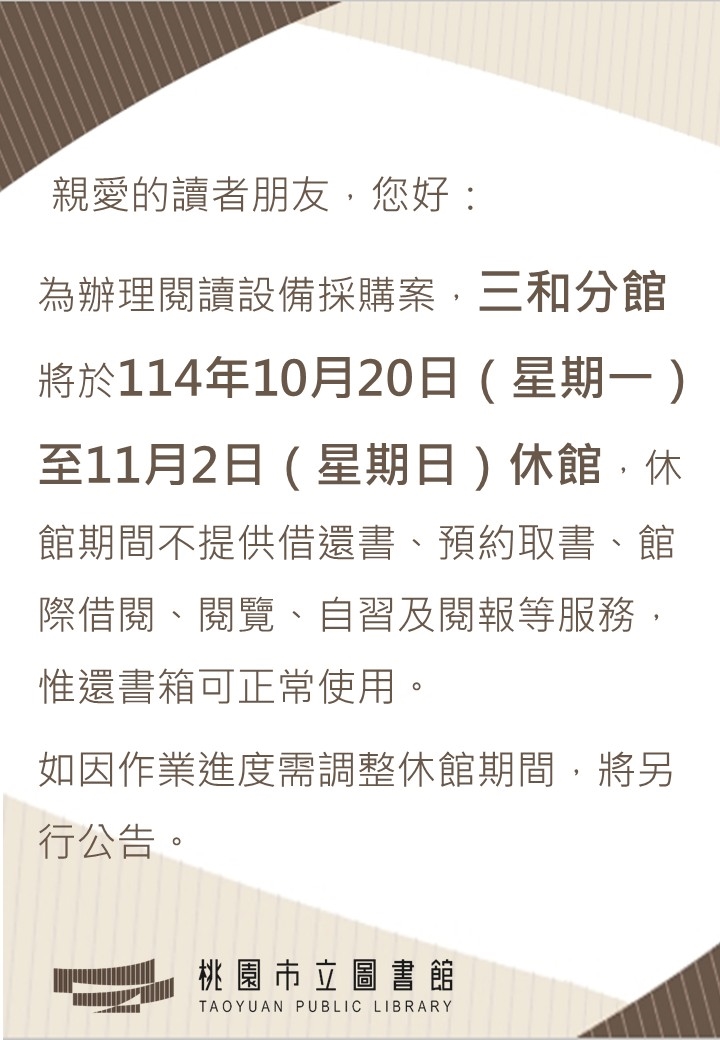 親愛的讀者您好:一、為辦理「114年桃園市立圖書館三和分館閱讀設備採購案」,三和分館將於 114年10月20日(星期一)至11月2日(星期日)暫停開放。二、休館期間不開放現場借還書、預約取書、館際借閱、館內閱覽、自習及閱報等服務,惟還書箱正常提供服務。三、如遇其他因素需調整休館期間,將視作業期程另行公告。