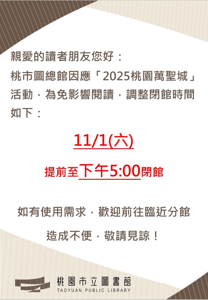 桃市圖總館因應「2025桃園萬聖城」活動,為免影響閱讀,11/1(六)提前至下午5點整閉館。