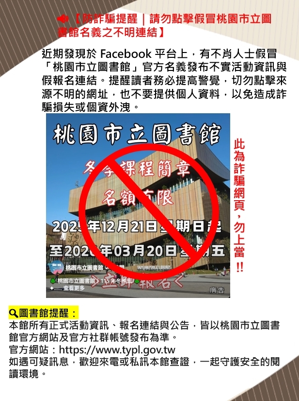近期發現於 Facebook 平台上,有不肖人士假冒「桃園市立圖書館」官方名義發布不實活動資訊與假報名連結。提醒讀者務必提高警覺,切勿點擊來源不明的網址,也不要提供個人資料,以免造成詐騙損失或個資外洩。🔍 圖書館提醒:本館所有正式活動資訊、報名連結與公告,皆以桃園市立圖書館官方網站及官方社群帳號發布為準。官方網站:https://www.typl.gov.tw如遇可疑訊息,歡迎來電或私訊本館查證,一起守護安全的閱讀環境。