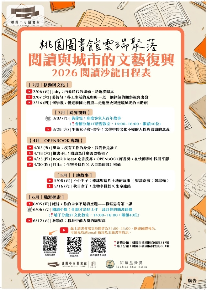 桃園市立圖書館表示,本次活動不強調艱深理論,而是希望以陪伴與對話為核心,讓讀者將書中的靈感帶回生活現場。全系列共規劃14場活動,其中12場採YouTube線上直播,突破時間與空間限制,讓不同生活型態的市民皆能參與;另規劃2場實體沙龍,促進更具溫度的面對面交流。