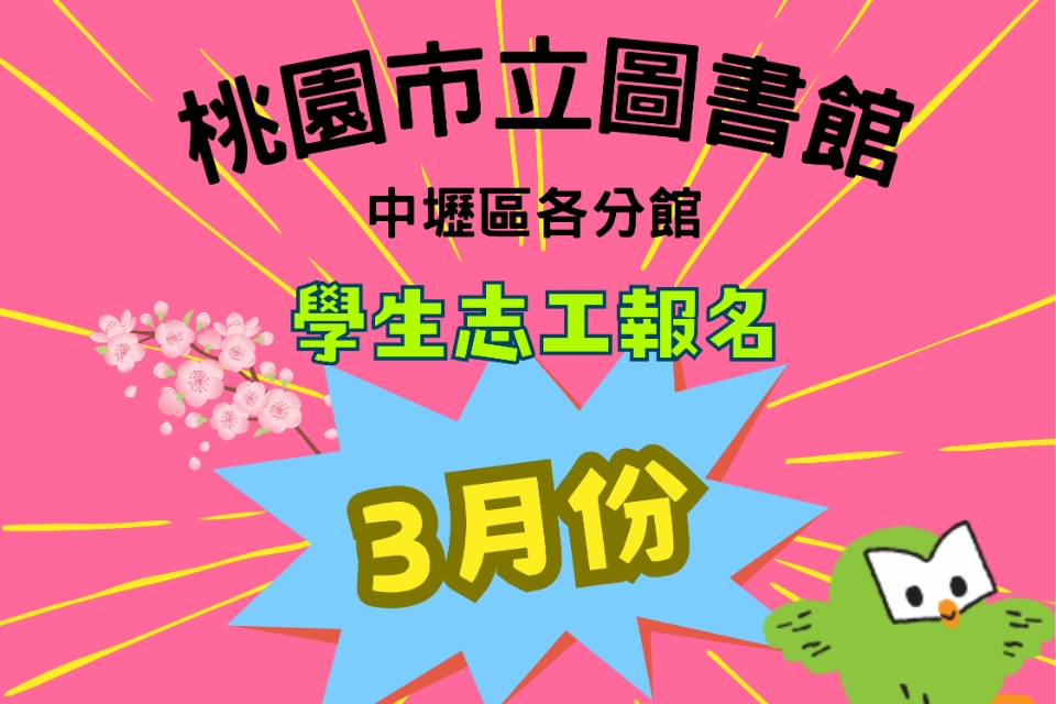115年03月【桃園區分館】學生志工將於115/02/02(一)上午9時開放線上報名