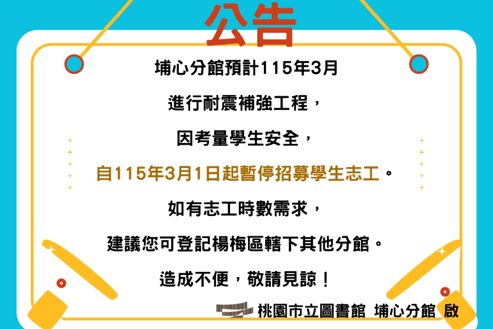 [埔心公告]埔心分館自115年3月1日起暫停招募學生志工