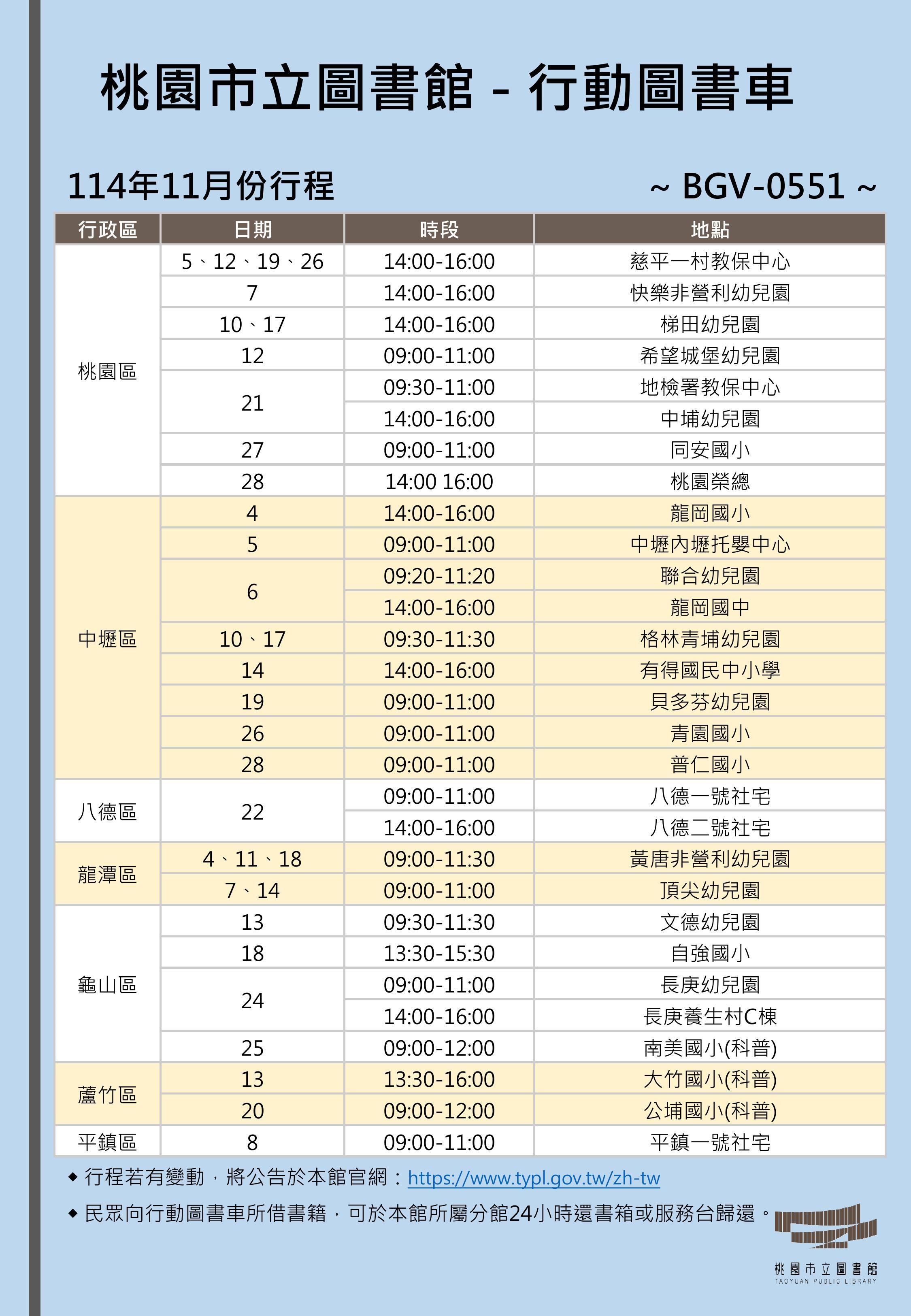 114年11月份行動圖書車行程表-總館線(BGV0551)