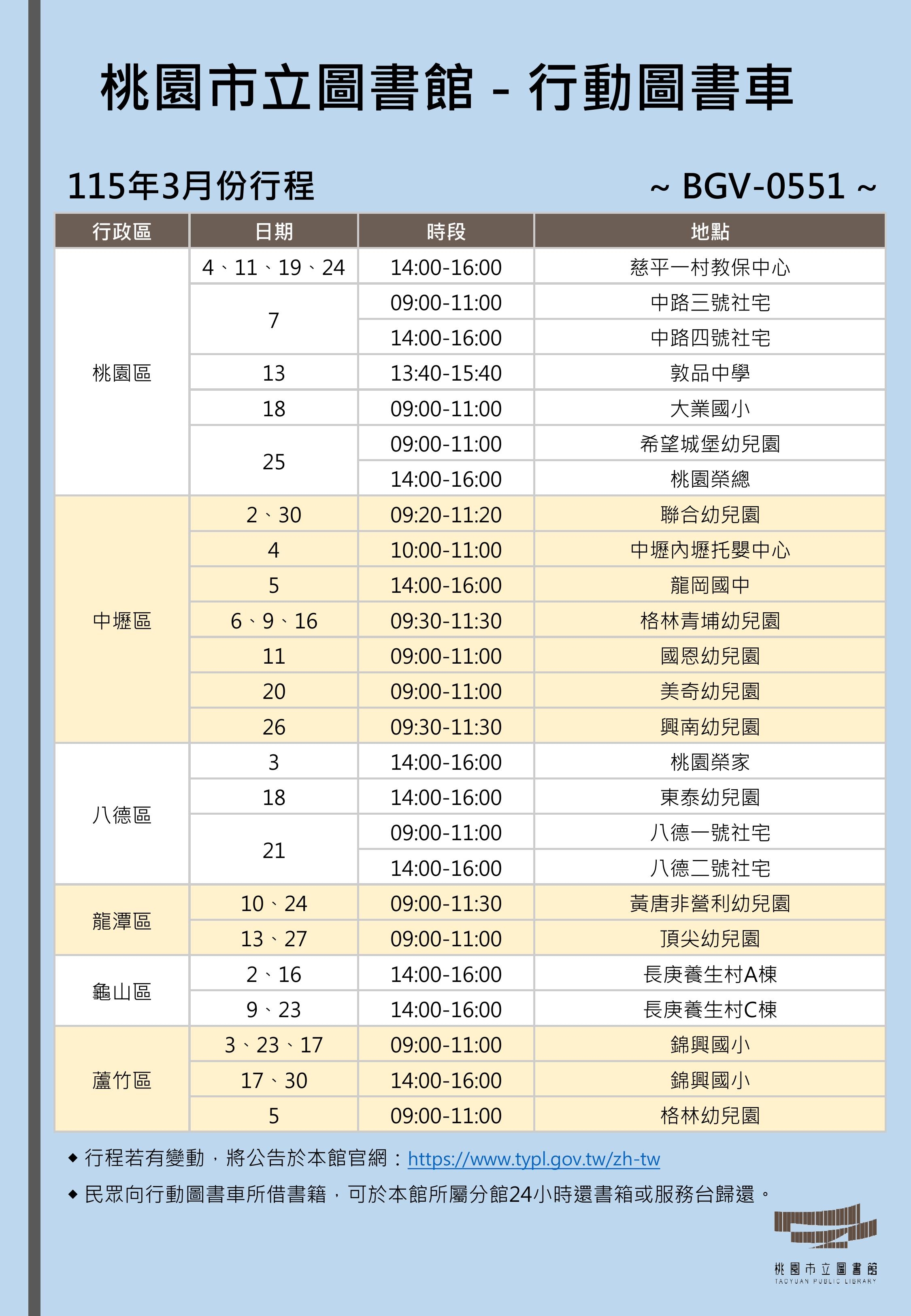 115年3月份行動圖書車行程表-總館線(BGV0551)