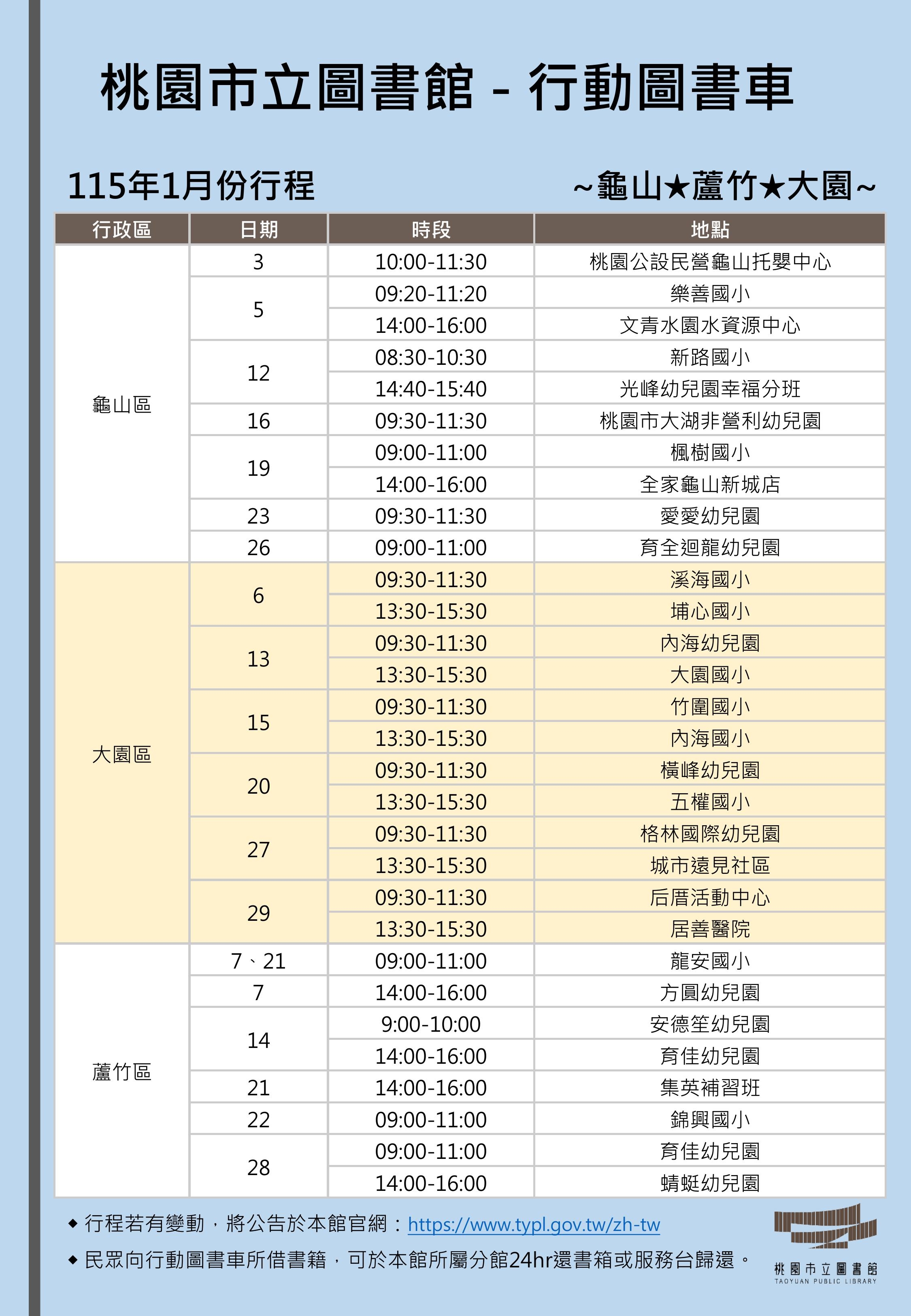 115年1月份行動圖書車行程表-龜山線