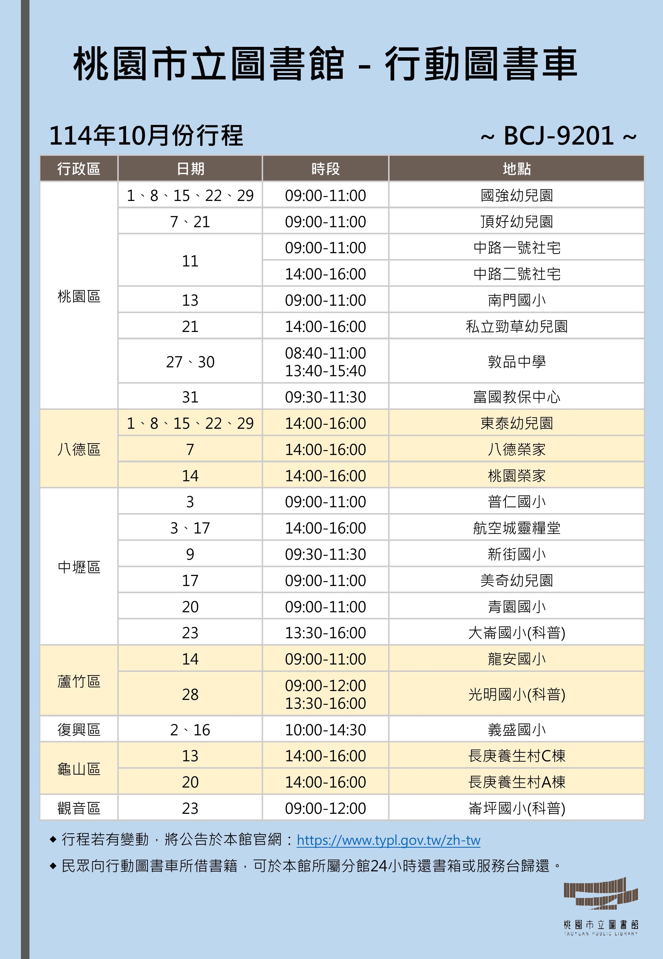 114年10月份行動圖書車行程表-總館線(BCJ9201)