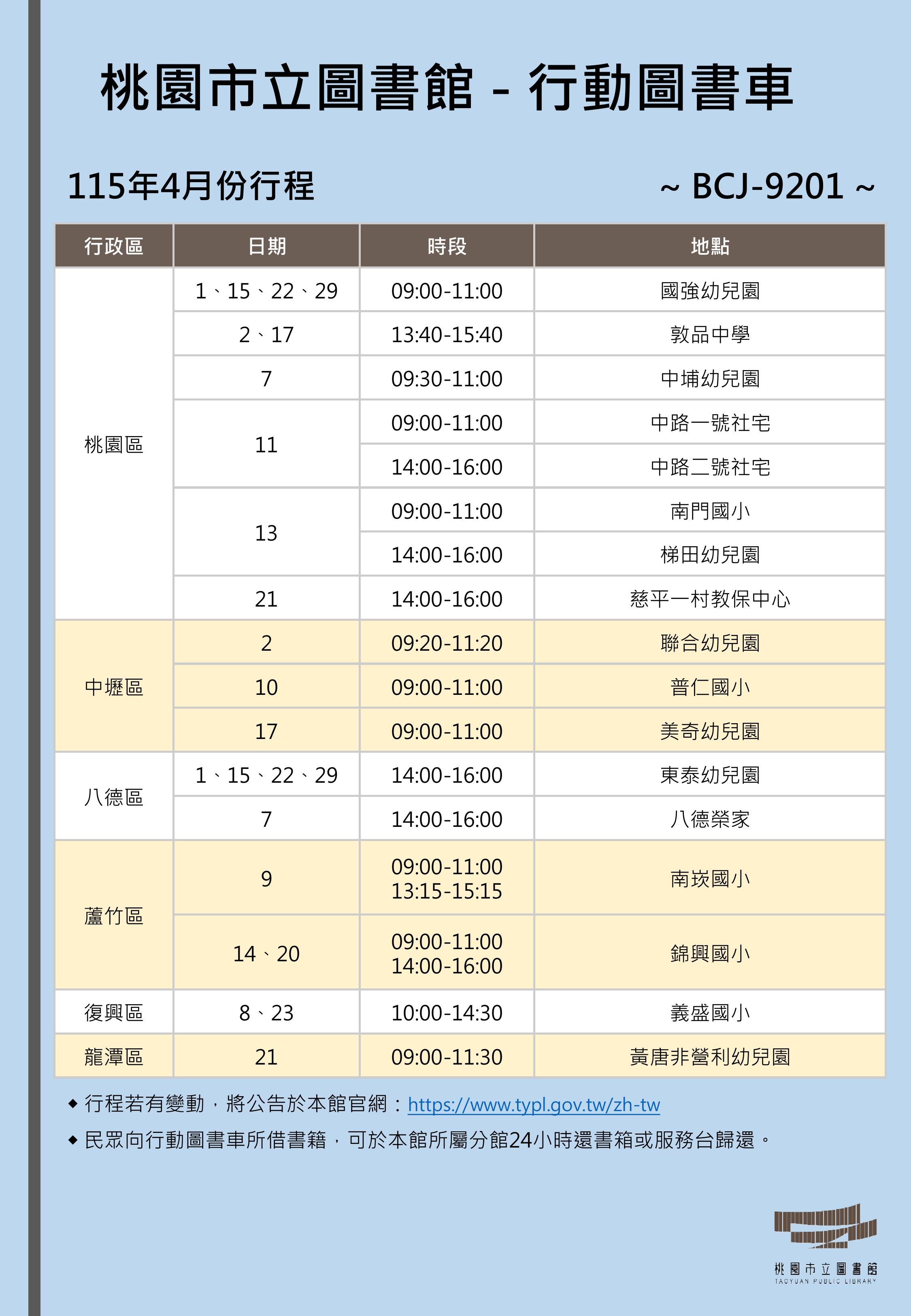 115年4月份行動圖書車行程表-總館線(BCJ9201)