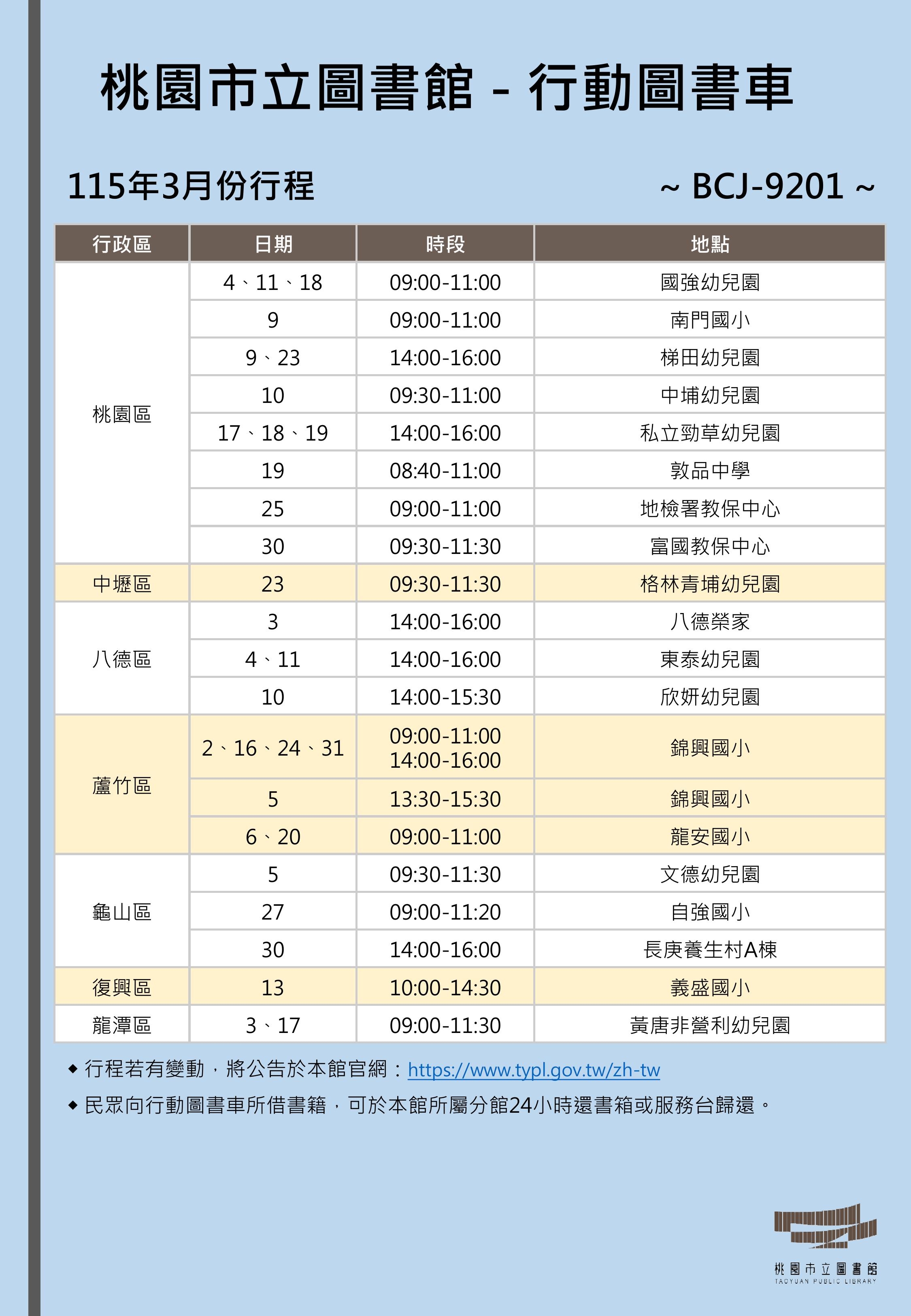115年3月份行動圖書車行程表-總館線(BCJ9201)