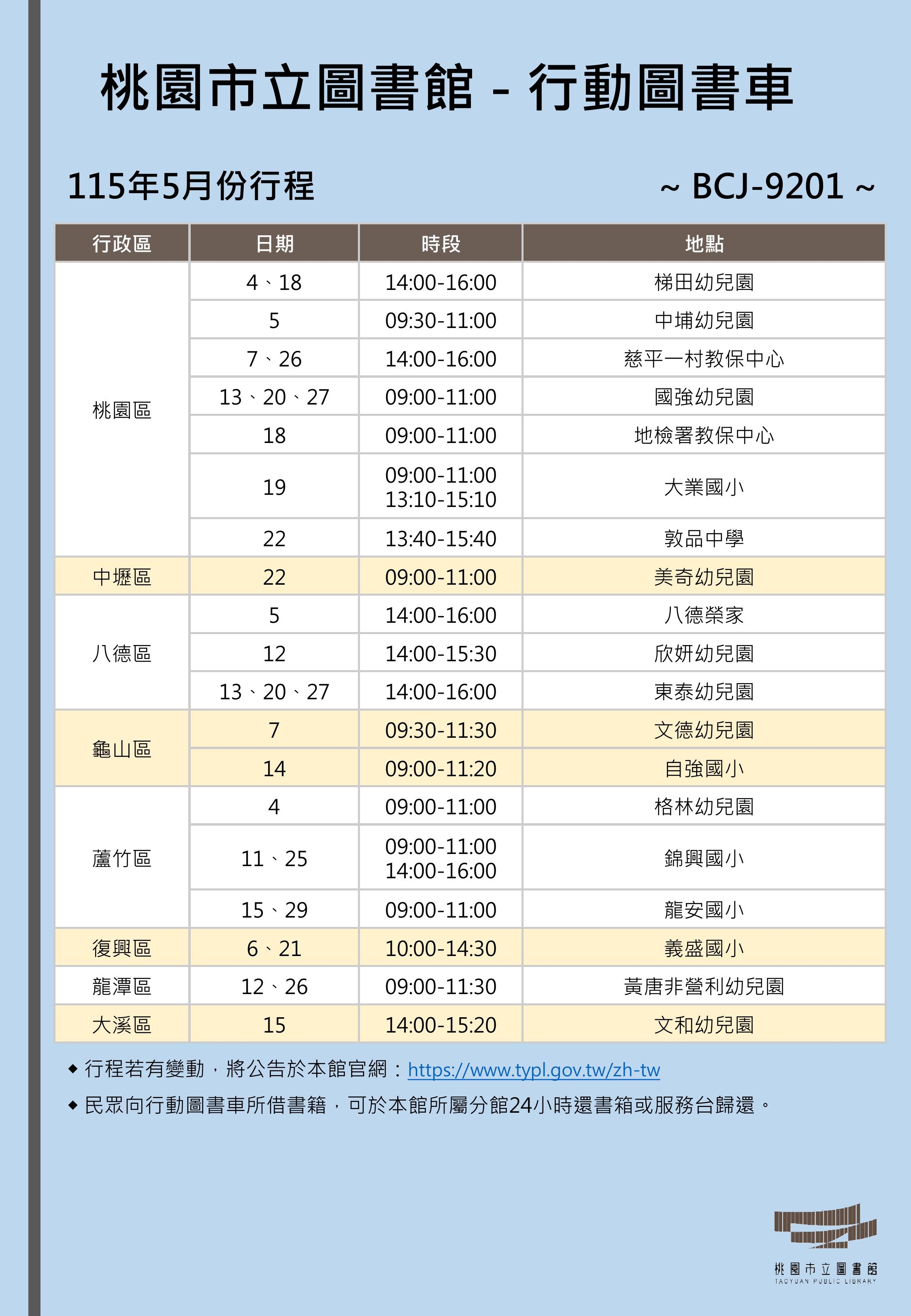 115年5月份行動圖書車行程表-總館線(BCJ9201)