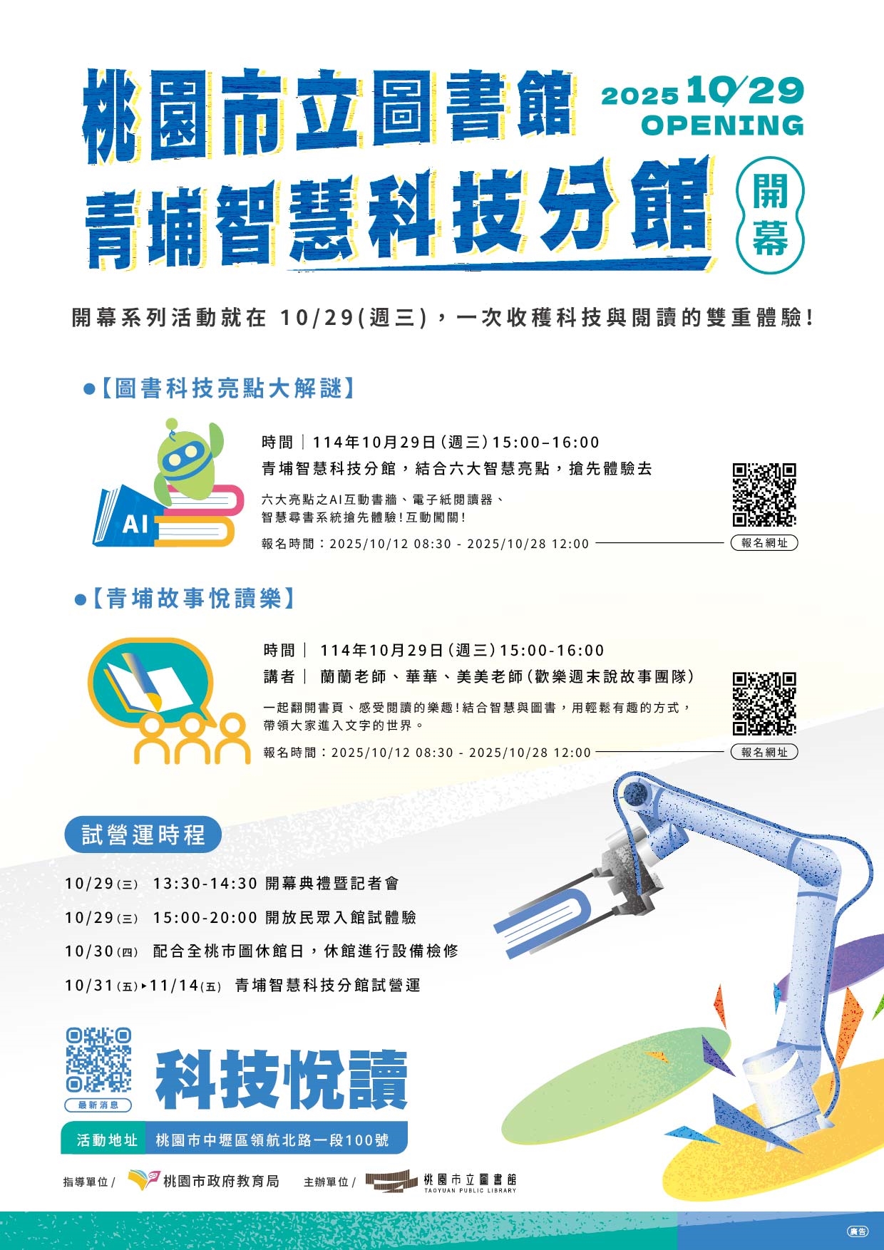 桃園市立圖書館再添新據點!位於中壢青埔重點發展區的「青埔智慧科技分館」,歷經精心籌劃與施工,將於114年10月29日(星期三)正式啟用,新館以「智慧科技 × 閱讀創新」為核心概念,結合桃園埤塘意象與前瞻科技設備,打造兼具人文底蘊與智慧應用的未來型圖書館。