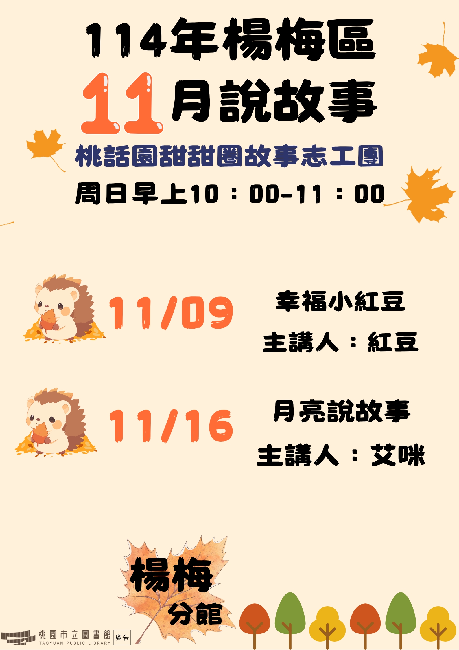 1.活動簡介: 由故事志工團體藉由說故事及延伸活動,帶領進入閱讀世界。2.活動時間: 週日上午10:00-11:003.主講團隊: 桃話園甜甜圈故事志工團4.活動地點: 楊梅分館1樓兒童區5.活動場次:11/9«幸福小紅豆» /紅豆11/16«月亮說故事» /艾咪※ 免費自由入場,無需報名
