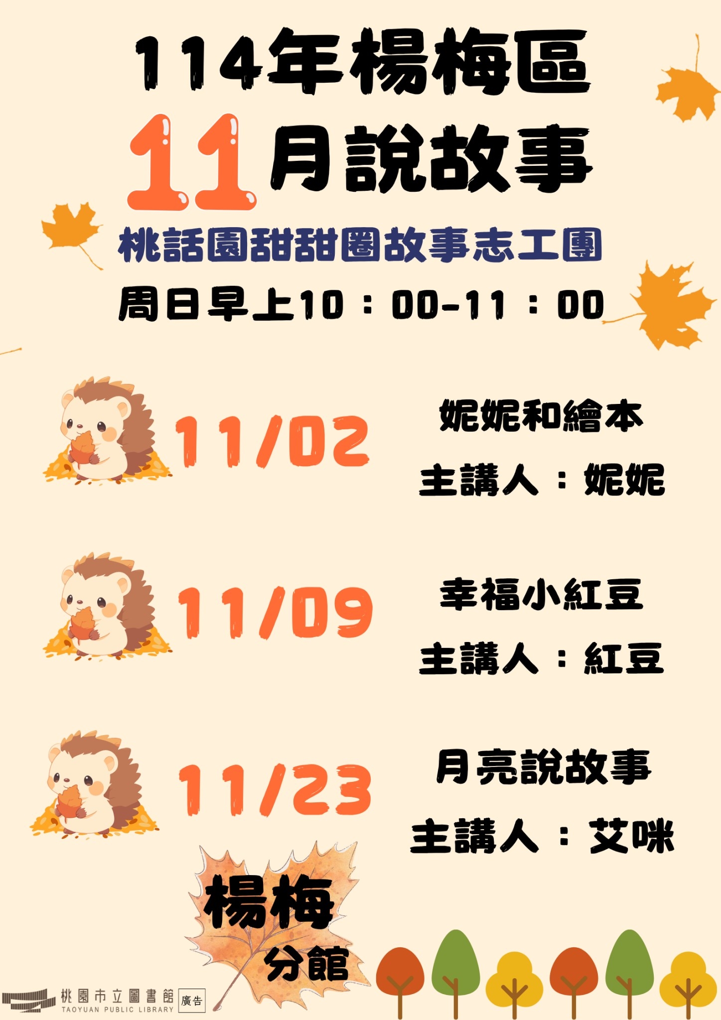 1.活動簡介: 由故事志工團體藉由說故事及延伸活動,帶領進入閱讀世界。2.活動時間: 週日上午10:00-11:003.主講團隊: 桃話園甜甜圈故事志工團4.活動地點: 楊梅分館1樓兒童區5.活動場次:11/2«妮妮和繪本» /妮妮11/9«幸福小紅豆» /紅豆11/23«月亮說故事» /艾咪※ 免費自由入場,無需報名