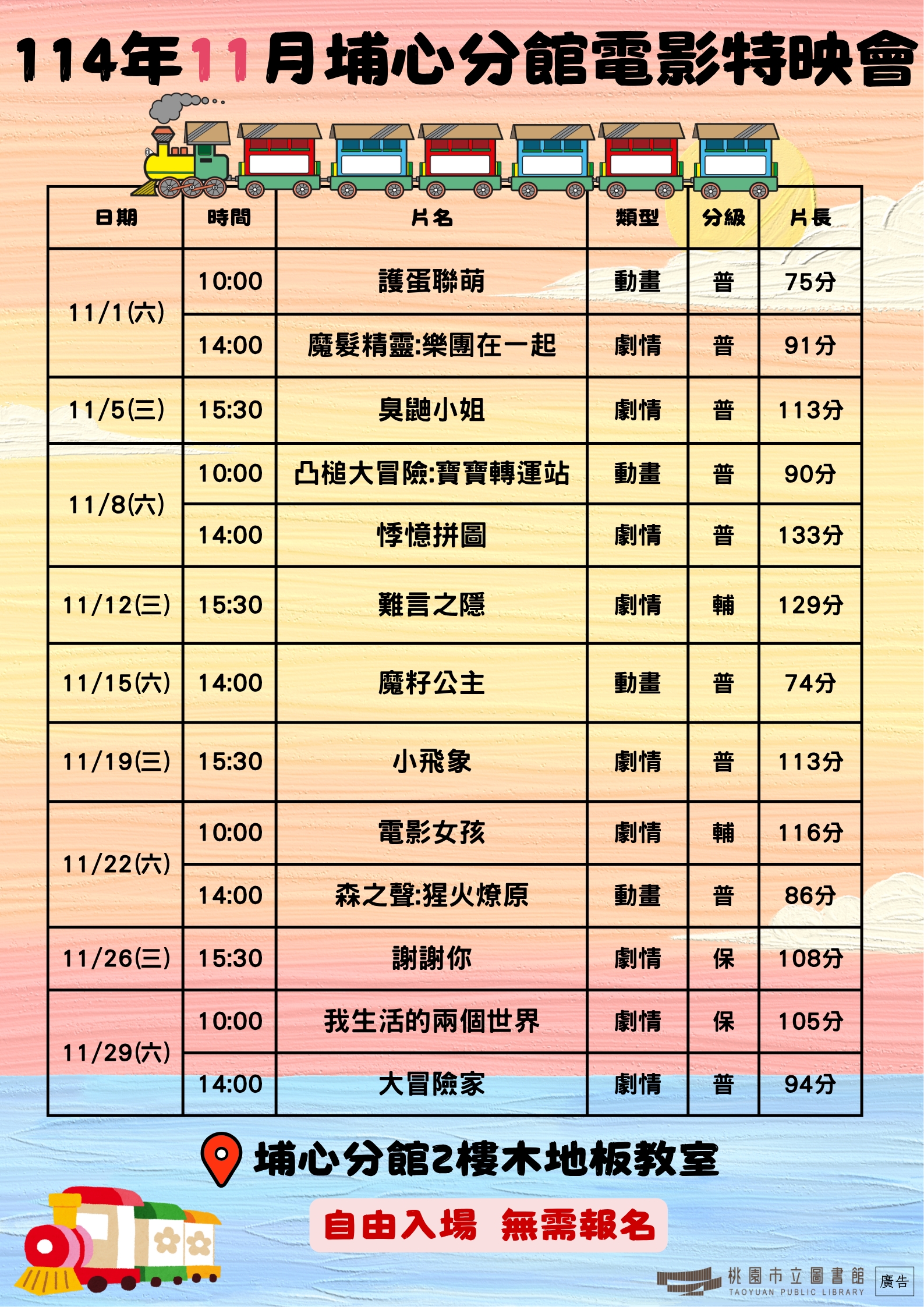 號外號外!!楊梅區電影院好評不斷,特映會加碼放映!!!歡迎每位大朋友小朋友一起來觀賞本館精心挑選的絕世好片~~11/1起,將在每週三下午15:30 每週六早上10:00及下午14:00播映(以公告電影時刻表為準) ※播映地點:埔心分館2樓研習教室※電影時刻表:
