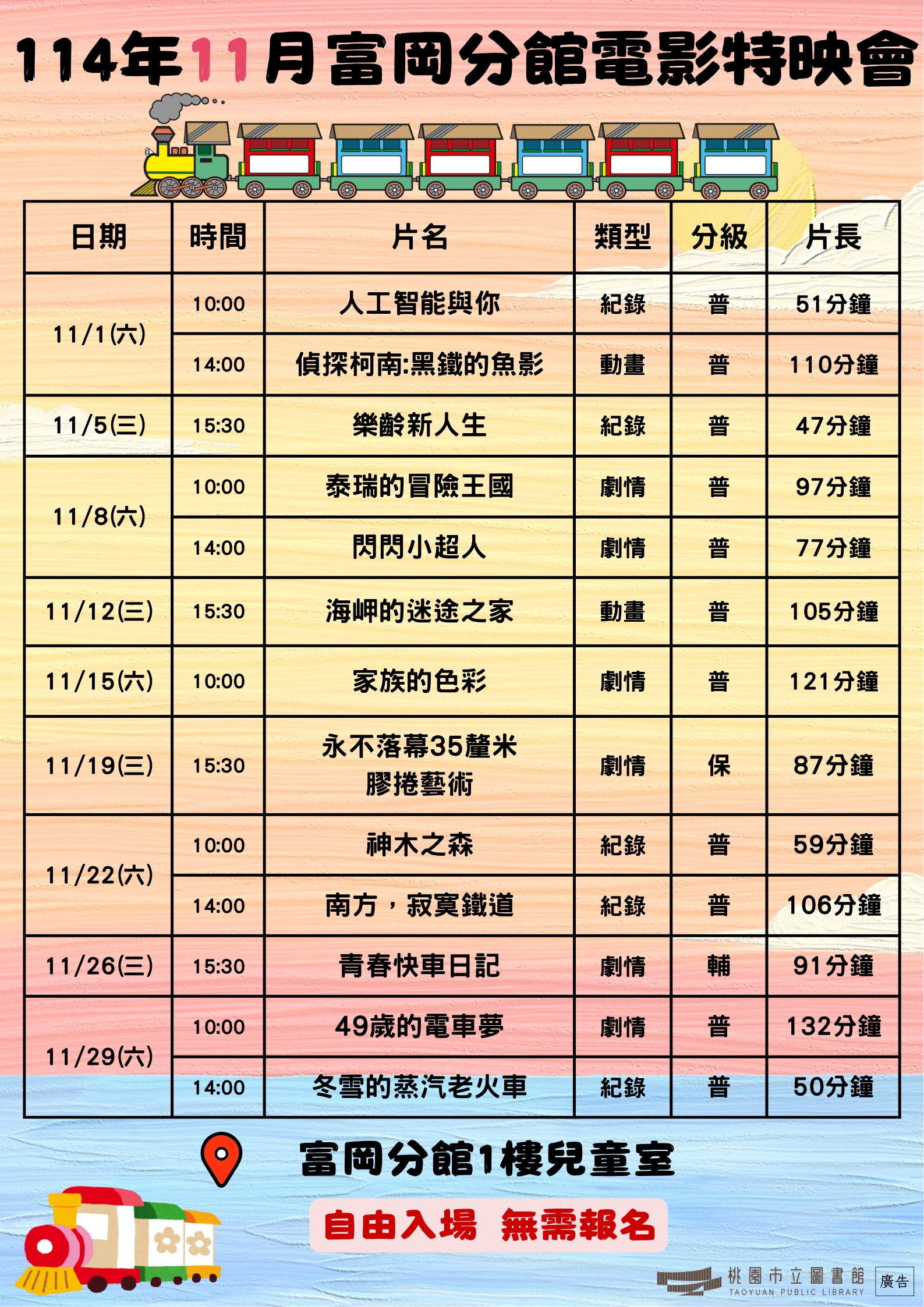 號外號外!!楊梅區電影院好評不斷,特映會加碼放映!!!歡迎每位大朋友小朋友一起來觀賞本館精心挑選的絕世好片~~11/1起,將在每週三下午15:30 每週六早上10:00及下午14:00播映(以公告電影時刻表為準) ※播映地點:富岡分館1樓兒童教室※電影時刻表: