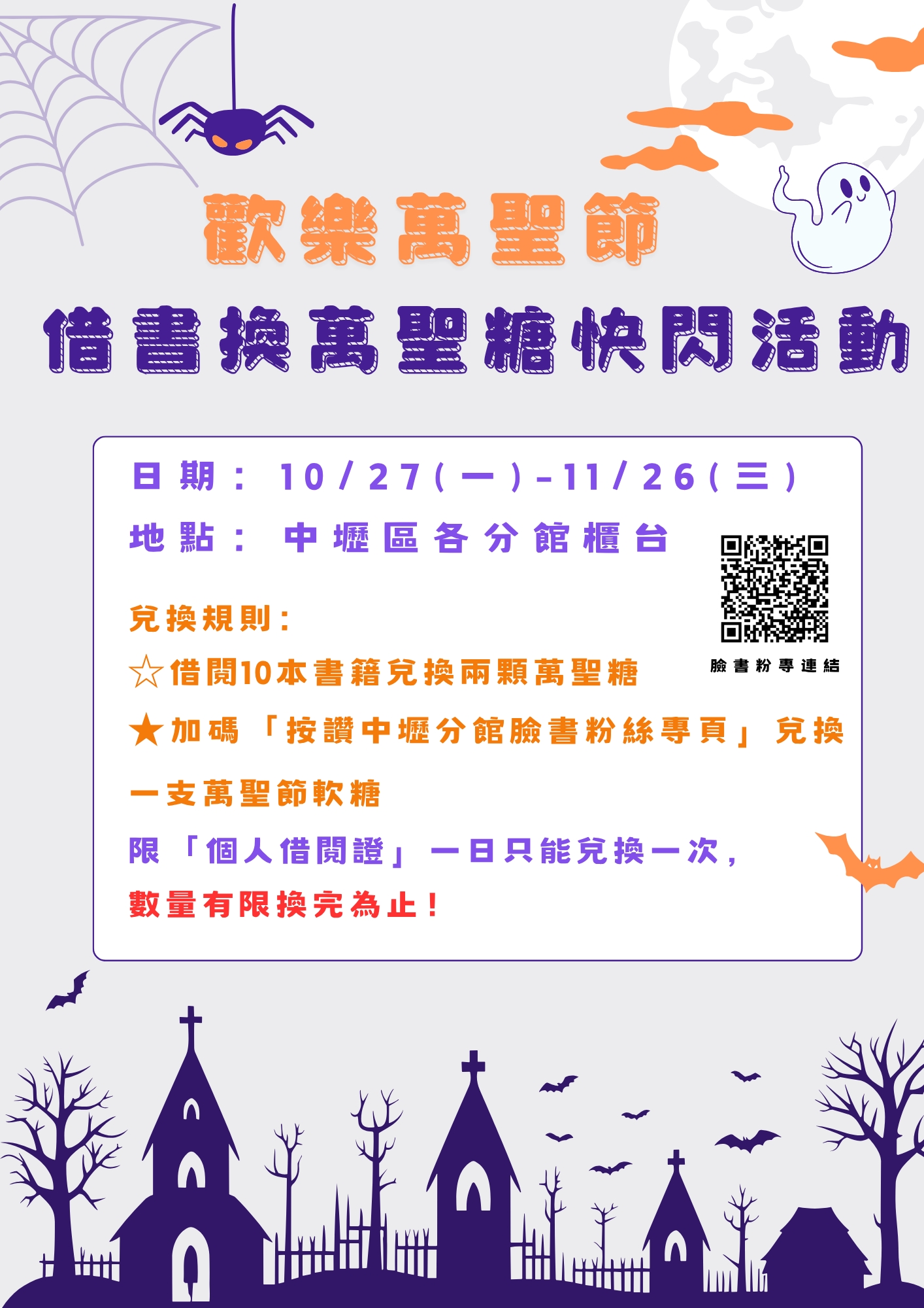 歡樂萬聖節:借書換萬聖糖快閃活動只要10/27(一)-11/26(三)期間內到中壢區各分館(中壢、內壢、龍岡、自強),「借閱10本書」即可兌換萬聖糖2顆額外加碼:完成上述借閱10本書+按讚中壢分館臉書粉絲專頁,可再獲得萬聖節造型軟糖1支!!限「個人借閱證」一日僅供兌換1次,數量有限換完為止!※此活動青埔智慧科技分館將於10/31(五)開放兌換#萬聖節快樂 #不給糖就搗蛋
