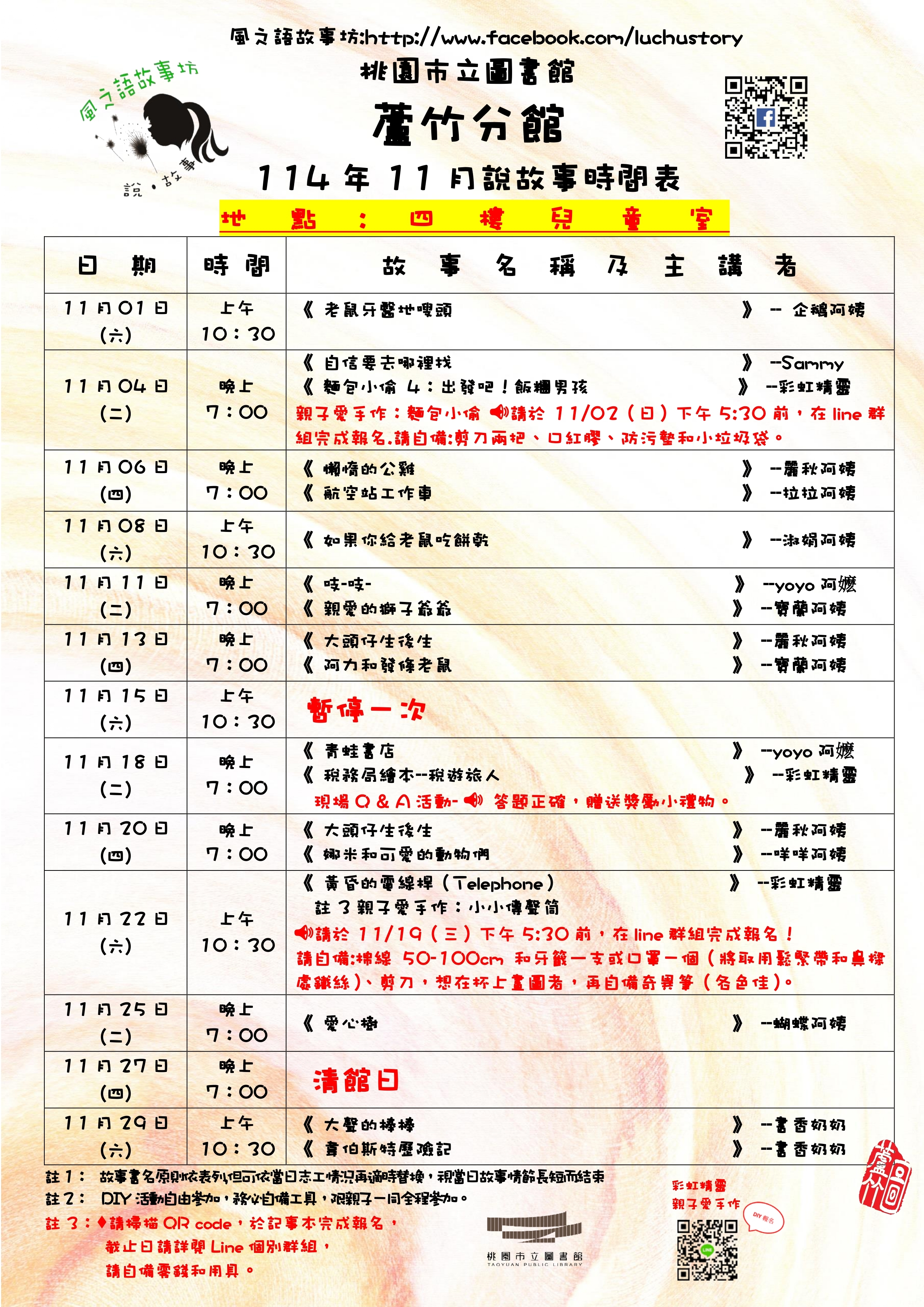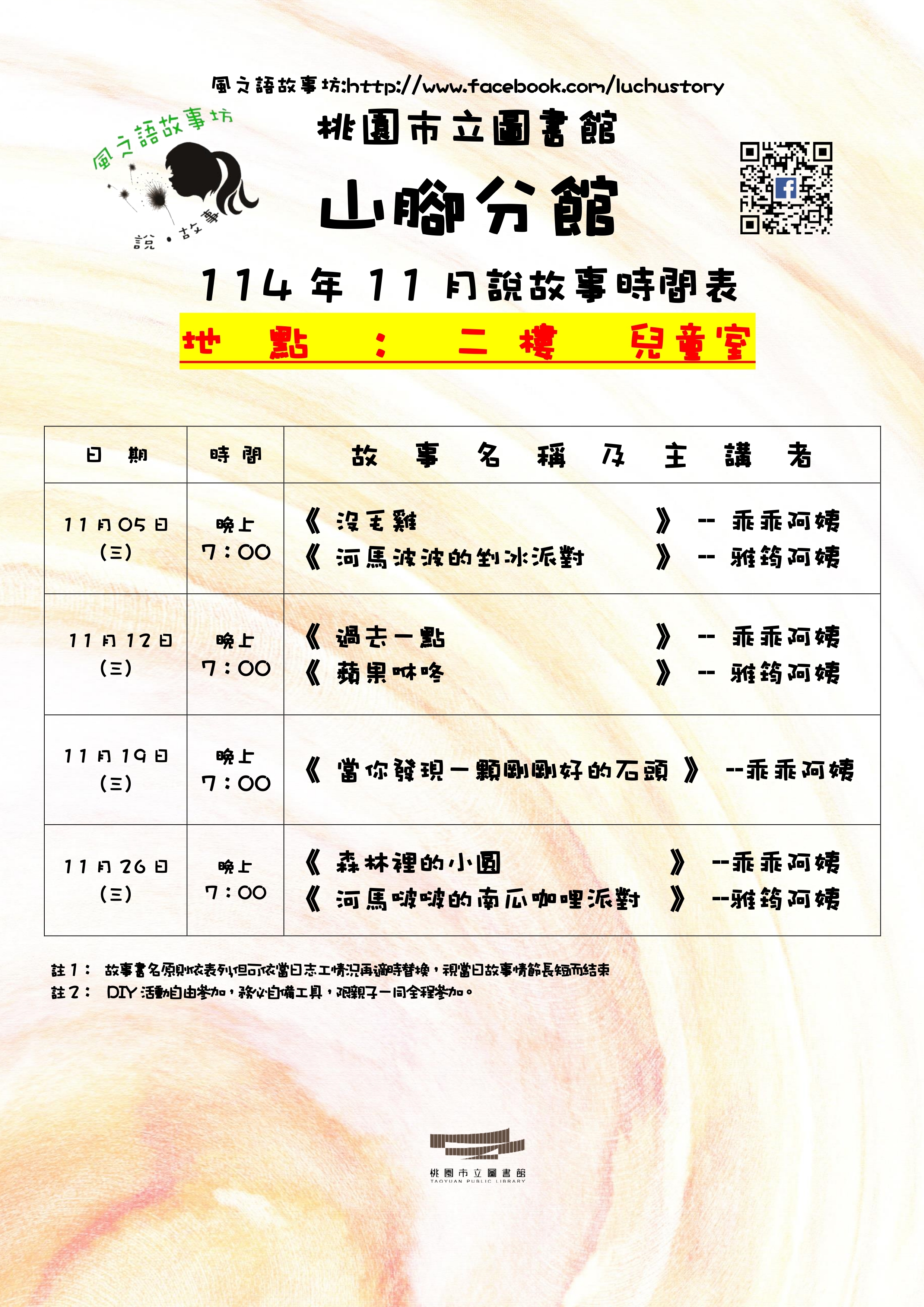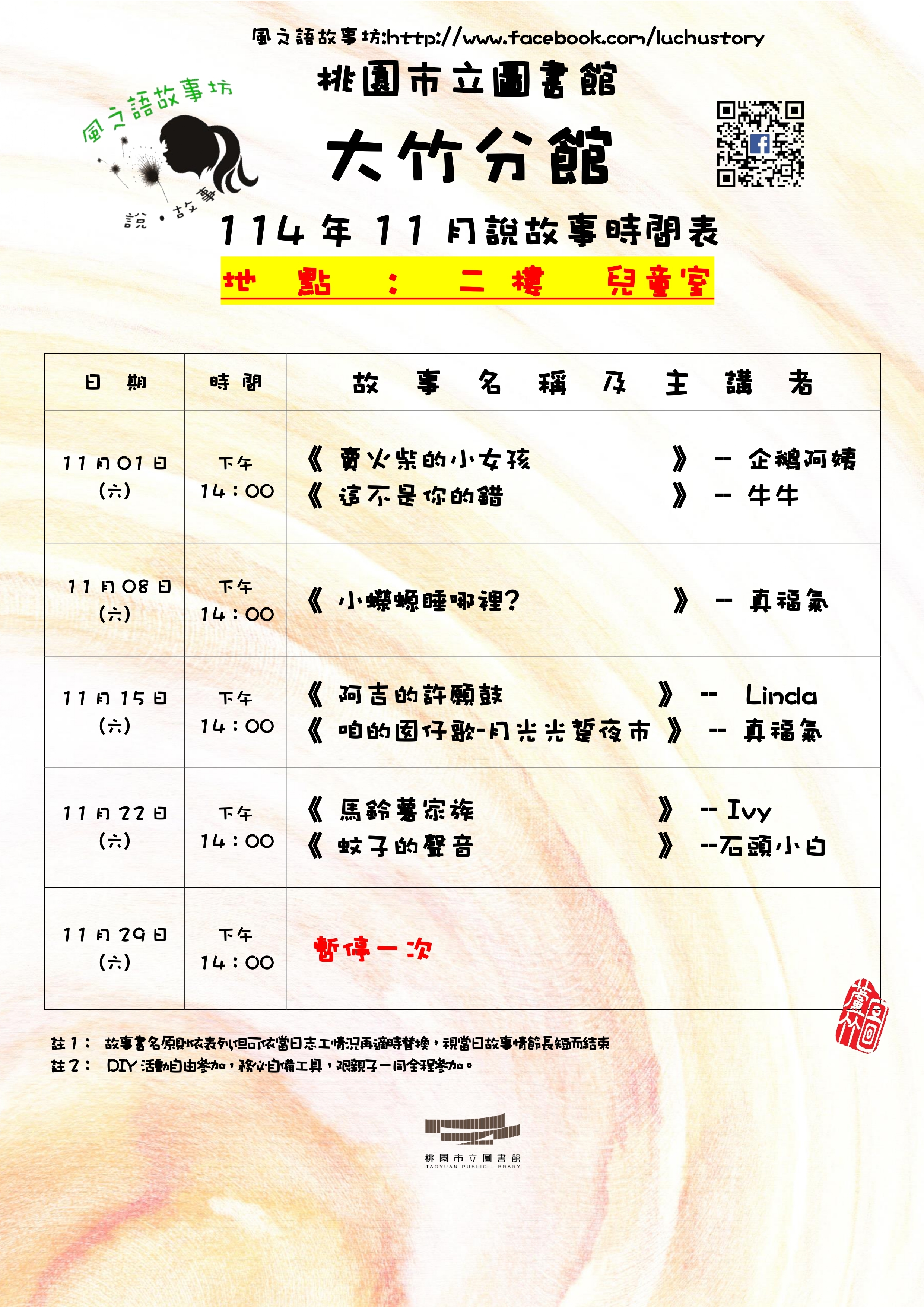 活動簡介: 由故事志工團體風之語故事坊的成員藉由說故事、美勞DIY、話劇表演等活動,引領孩子們進入繪本的世界裡。主講人:風之語故事坊蘆竹分館4樓兒童室活動時間:每週二、四 19:00-20:00、每週六 10:30-11:3003-3526811大竹分館兒童室活動時間:每週六 14:00-15:0003-3138034山腳分館兒童室活動時間:每週三 19:00-20:0003-3241325