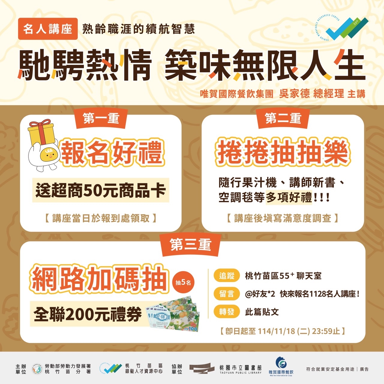 ☆ 加碼驚喜立即前往臉書粉專「桃竹苗區55+聊天室」查看。