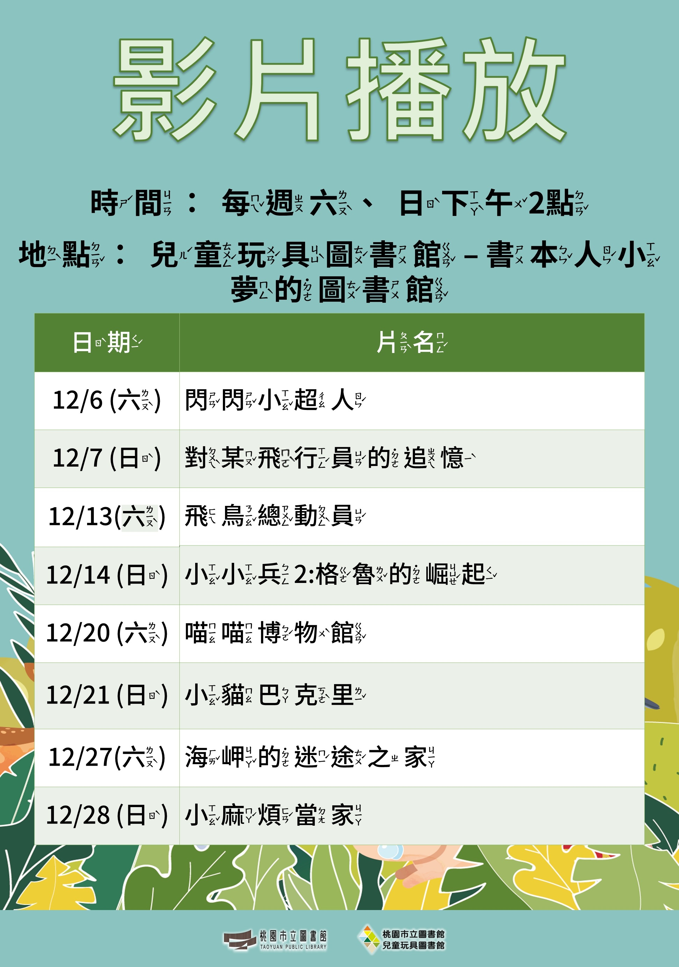🎬 玩具圖書館12月假日電影派對來啦! 🍿週末想找地方放鬆?快帶孩子來「書本人小夢的圖書館」一起看電影、笑開懷!📅 放映日期| 12/6、12/7、12/13、12/14、12/20、12/21、12/27、12/28🕑 播放時間| 下午2點📍 地點| 桃園市八德區重慶街36號(書本人小夢的圖書館)👨👩👧👦 親子一起觀影、共享歡樂時光~奇幻冒險、歡笑感動,全都在這個12月的電影下午茶時光等你來發現!