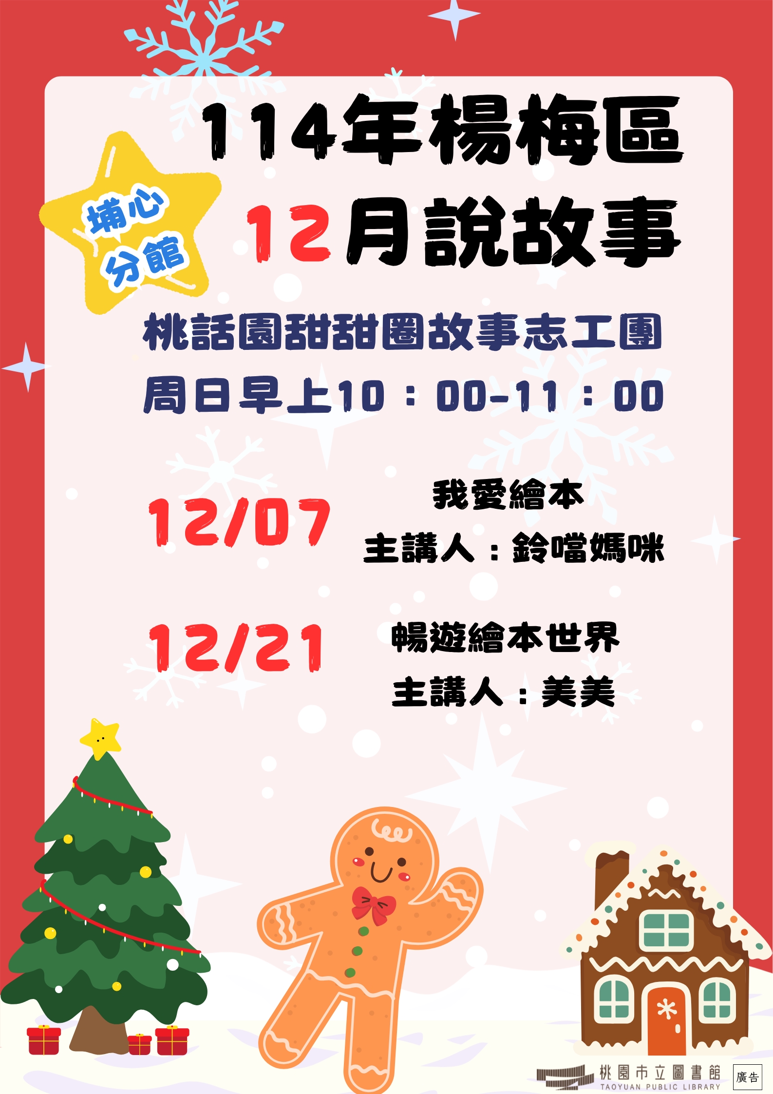 1.活動簡介: 由故事志工團體藉由說故事及延伸活動,帶領進入閱讀世界。2.活動時間: 週日上午10:00-11:003.主講團隊: 桃話園甜甜圈故事志工團4.活動地點: 埔心分館2樓木地板教室5.活動場次:12/07«我愛繪本» /鈴噹媽咪12/21«暢遊繪本世界» /美美※ 免費自由入場,無需報名