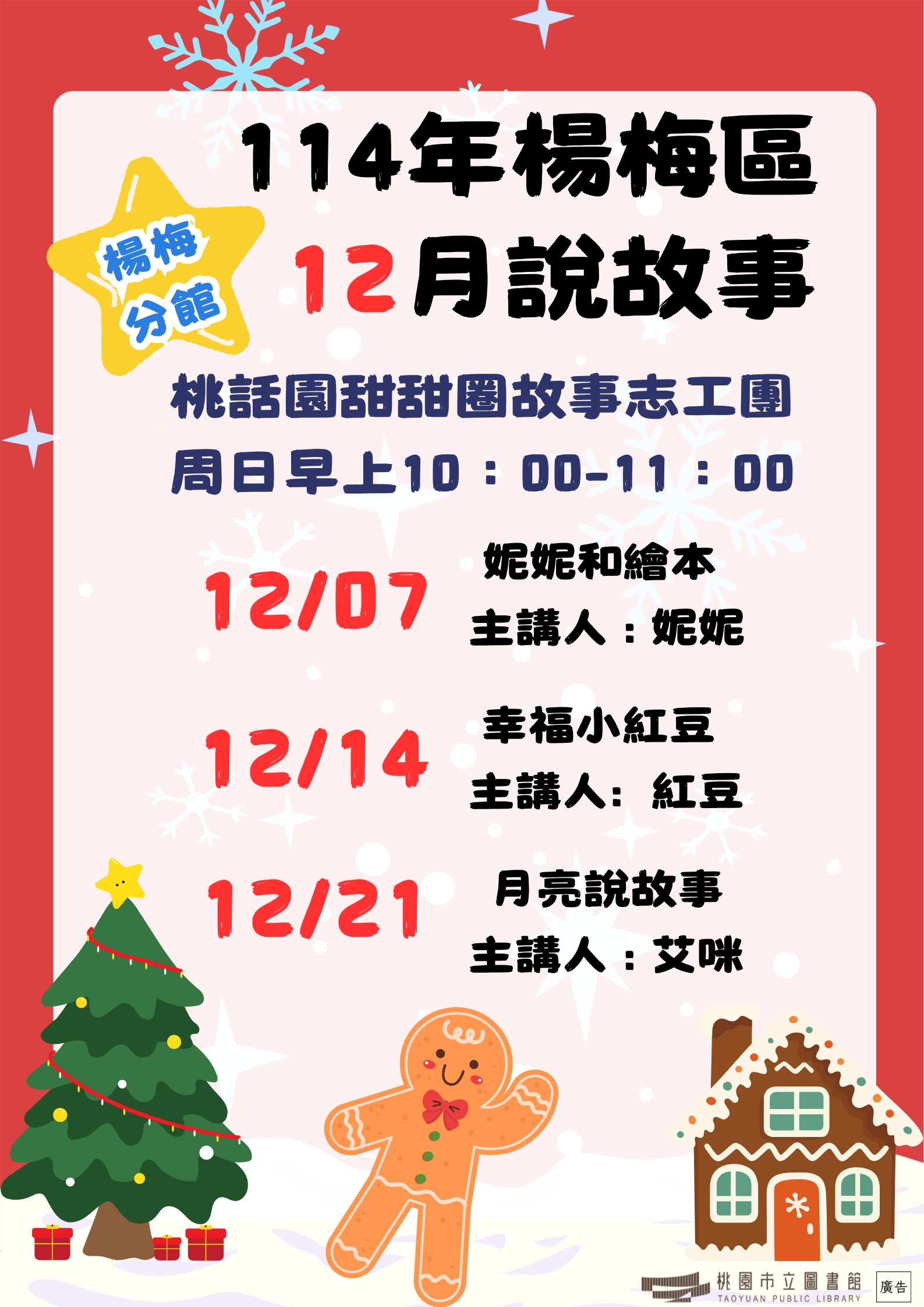 1.活動簡介: 由故事志工團體藉由說故事及延伸活動,帶領進入閱讀世界。2.活動時間: 週日上午10:00-11:003.主講團隊: 桃話園甜甜圈故事志工團4.活動地點: 楊梅分館1樓兒童區5.活動場次:12/07«妮妮和繪本» /妮妮12/14«幸福小紅豆» /紅豆12/21«月亮說故事» /艾咪※ 免費自由入場,無需報名