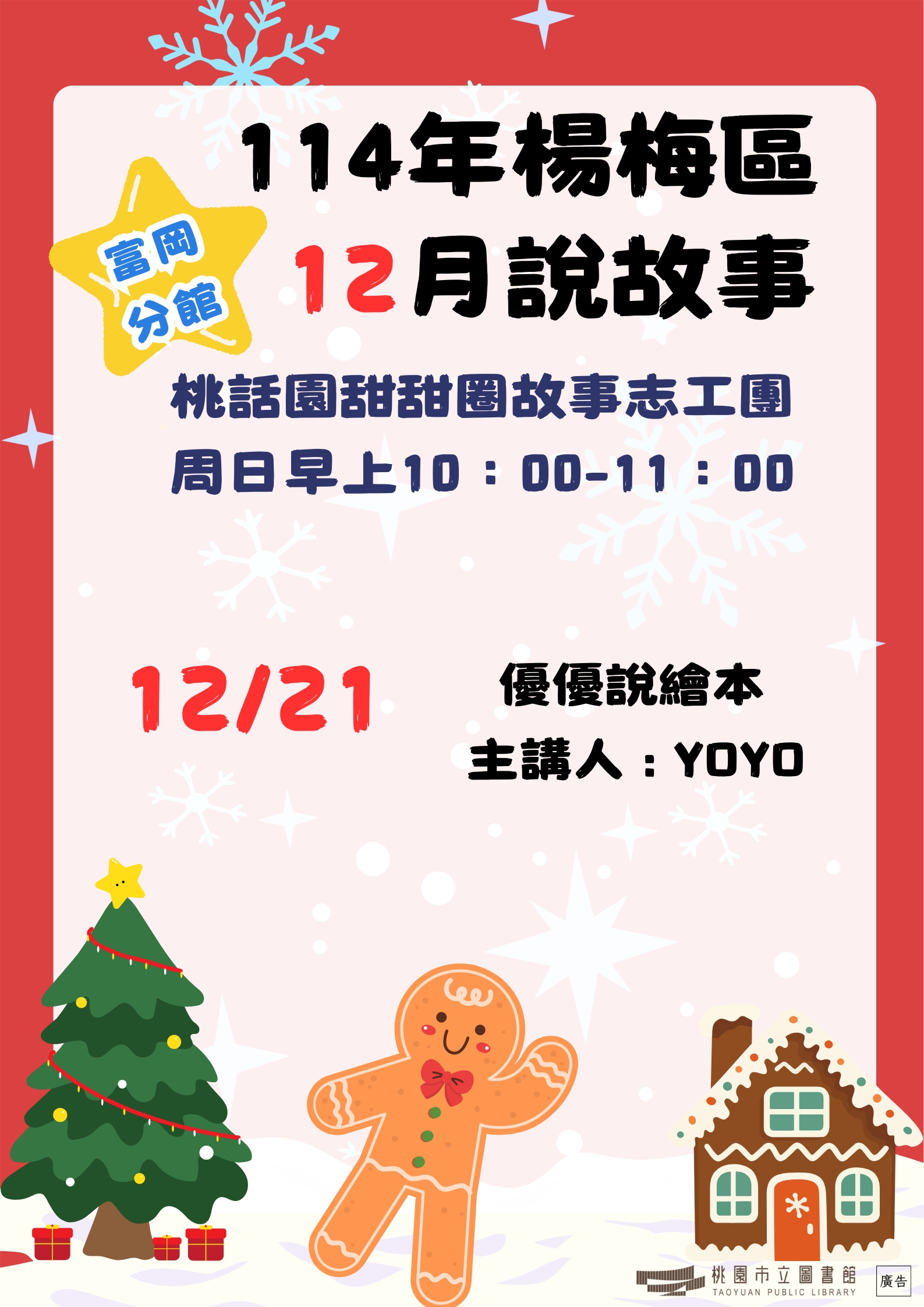 1.活動簡介: 由故事志工團體藉由說故事及延伸活動,帶領進入閱讀世界。2.活動時間: 週日上午10:00-11:003.主講團隊: 桃話園甜甜圈故事志工團4.活動地點: 富岡分館1樓兒童教室5.活動場次:12/21«優優說繪本» /YOYO※ 免費自由入場,無需報名