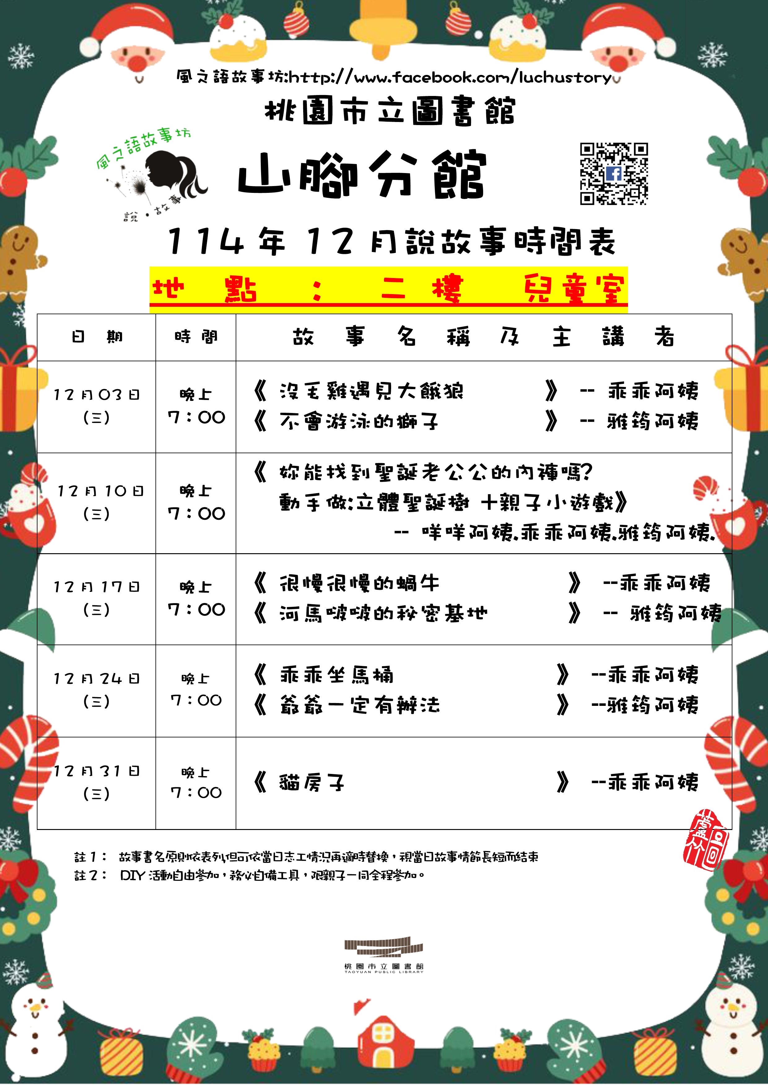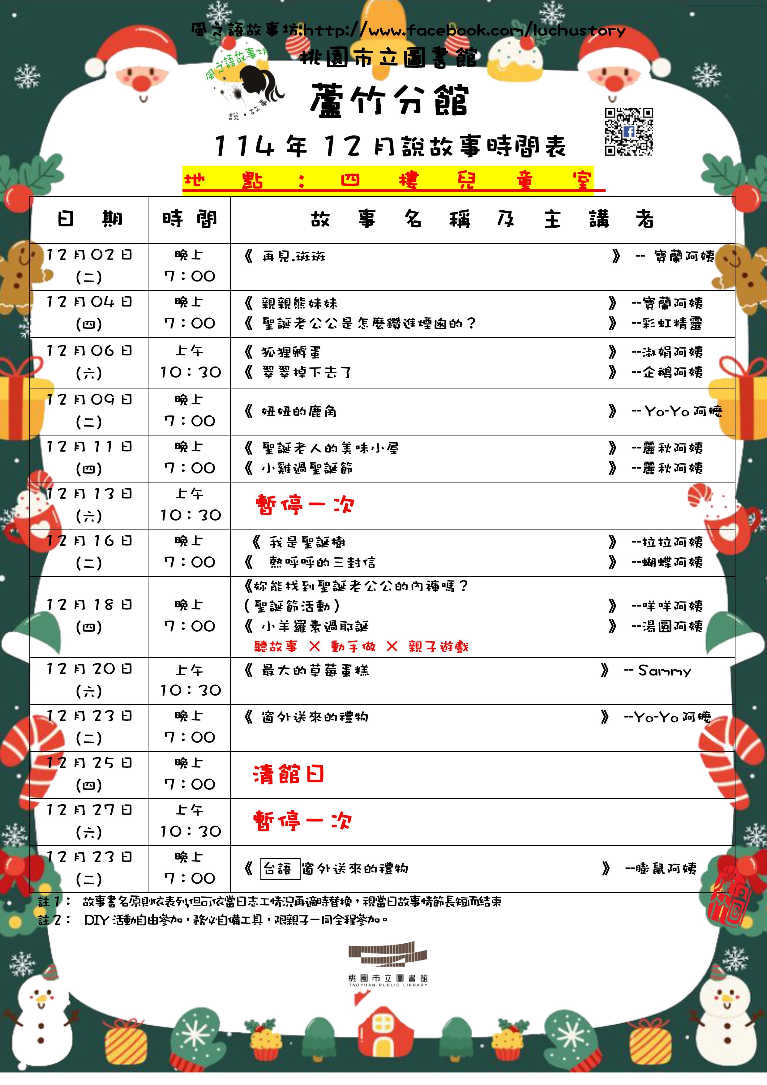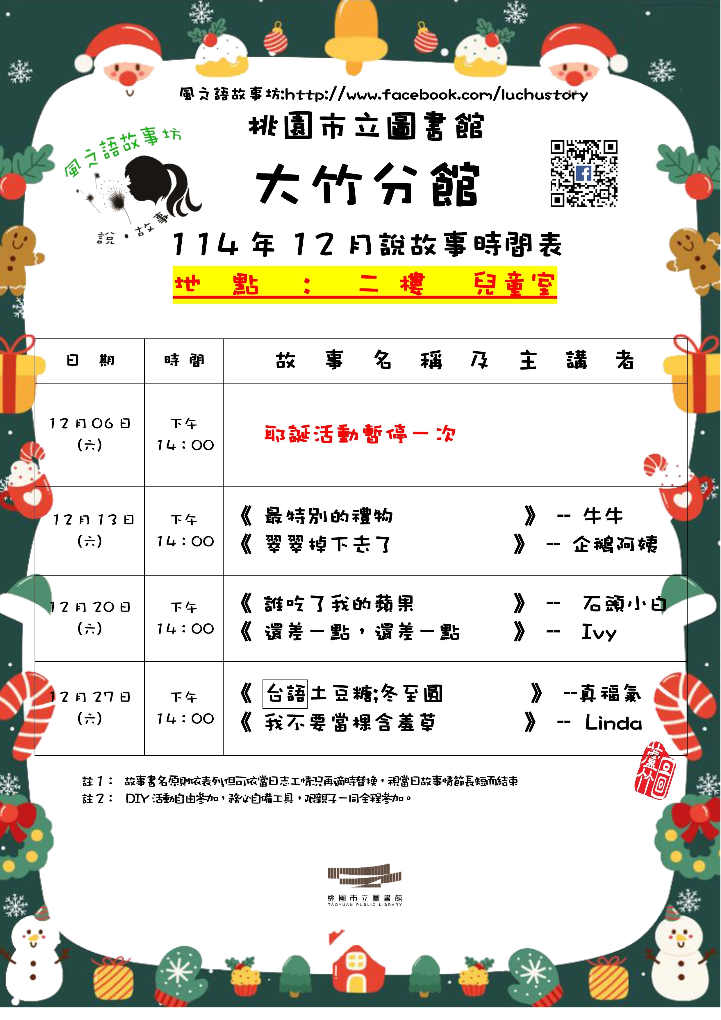 活動簡介: 由故事志工團體風之語故事坊的成員藉由說故事、美勞DIY、話劇表演等活動,引領孩子們進入繪本的世界裡。主講人:風之語故事坊蘆竹分館4樓兒童室活動時間:每週二、四 19:00-20:00、每週六 10:30-11:3003-3526811大竹分館兒童室活動時間:每週六 14:00-15:0003-3138034山腳分館兒童室活動時間:每週三 19:00-20:0003-3241325