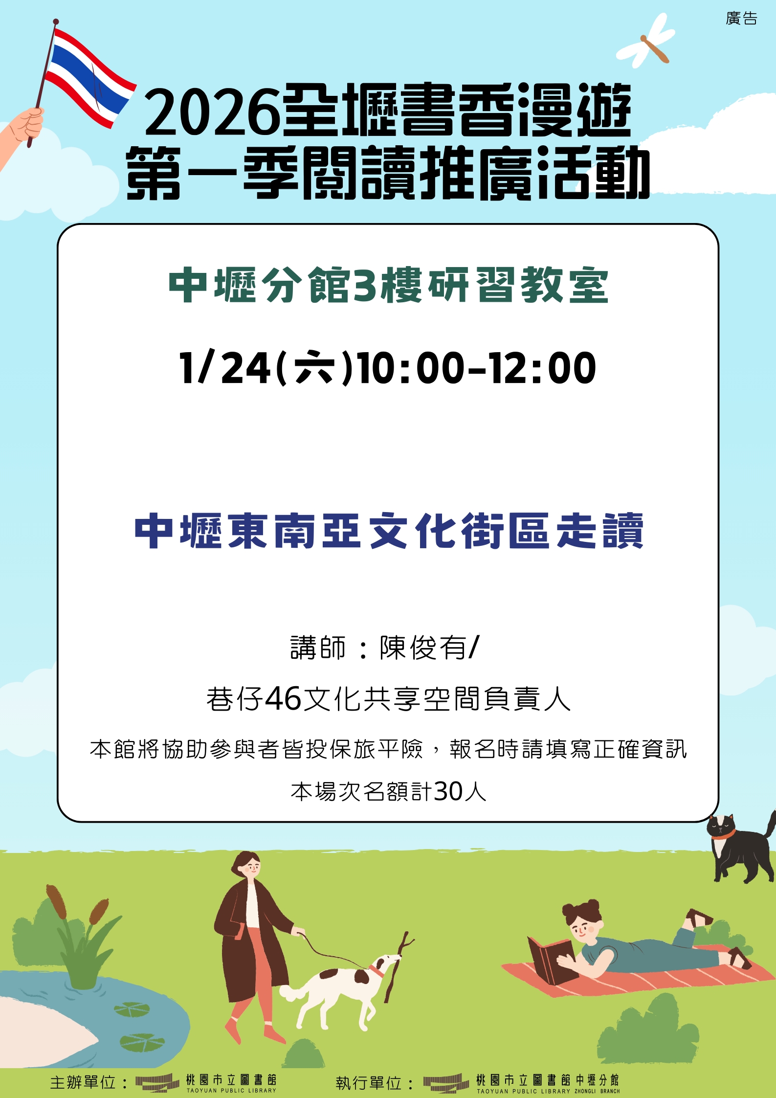 (二)中壢東南亞文化街區走讀1.時間:1/24(六)10:00~12:002.集合地點:中壢分館3樓研習教室3.講師:陳俊有/巷仔46文化共享空間負責人4.此為走讀活動皆會幫參與者保旅平險,請於報名時填寫正確的姓名、身分證號及出生年月日5.若因颱風及天候影響,導致無法順利出行,順延日期將會電話另行通知6.活動當天請提前15分鐘抵達集合地點報到,10點準時出發,逾時不候。●走讀路線:(待定)