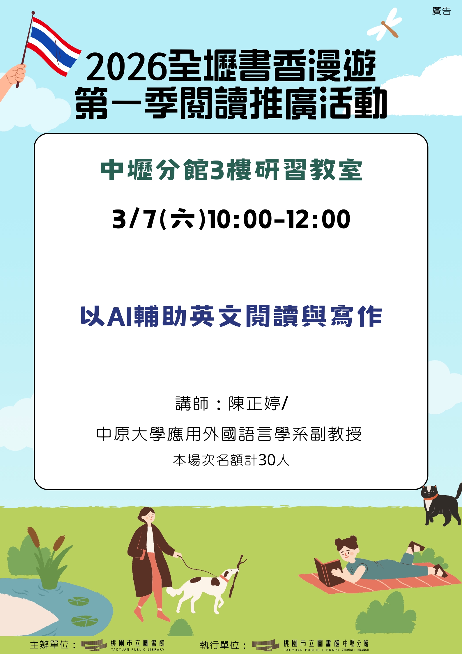 系列二:《探索AI新視界》講座(四)以AI輔助英文閱讀與寫作1.時間:3/7(六)10:00~12:002.地點:中壢分館3樓研習教室3.講師:陳正婷/中原大學應用外國語言學系副教授
