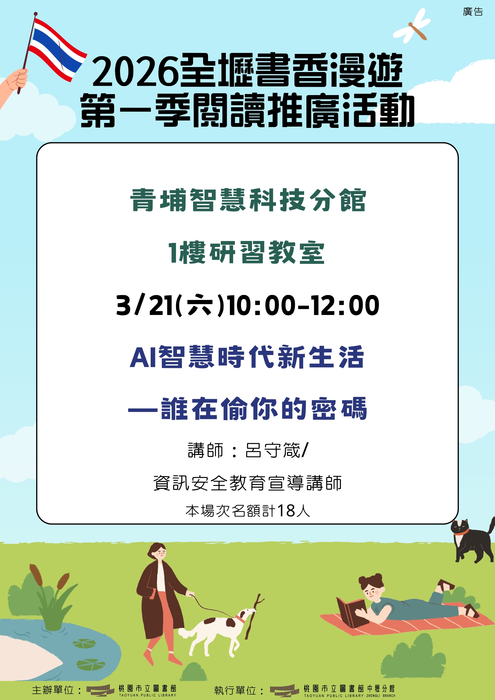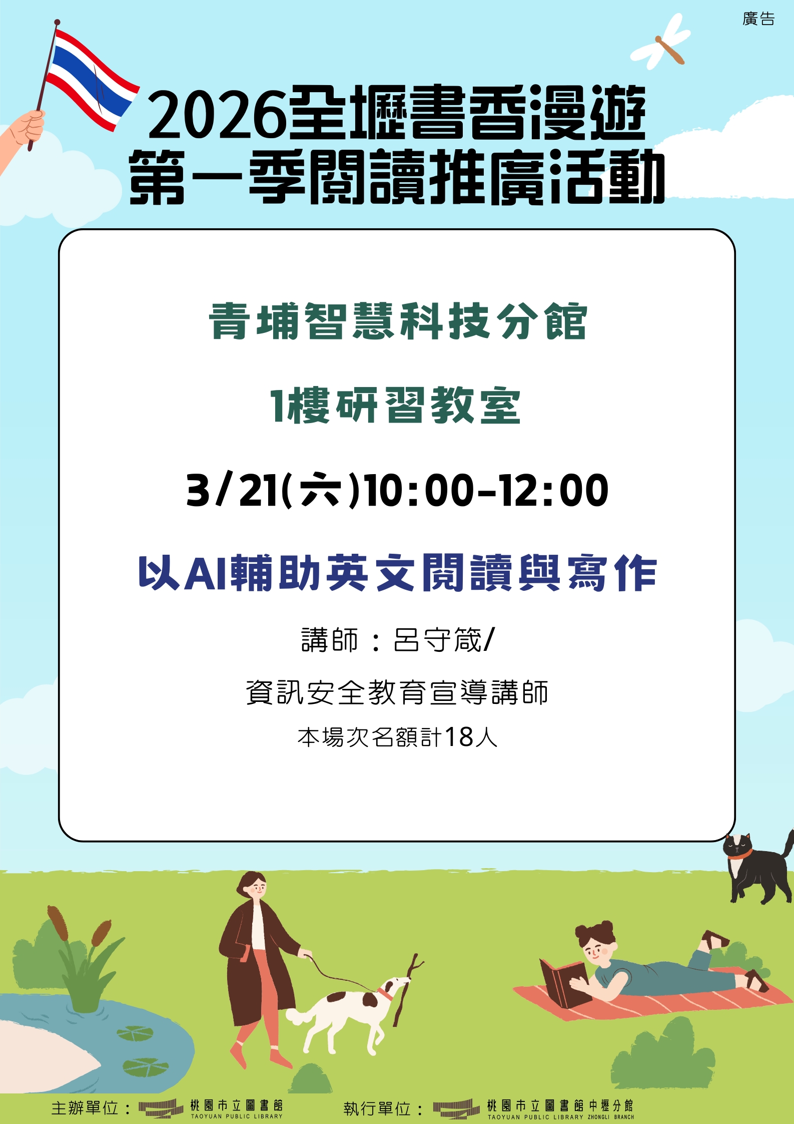 1.時間:3/21(六)10:00~12:002.地點:青埔智慧科技分館研習教室3.講師:呂守箴/資訊安全教育宣導講師