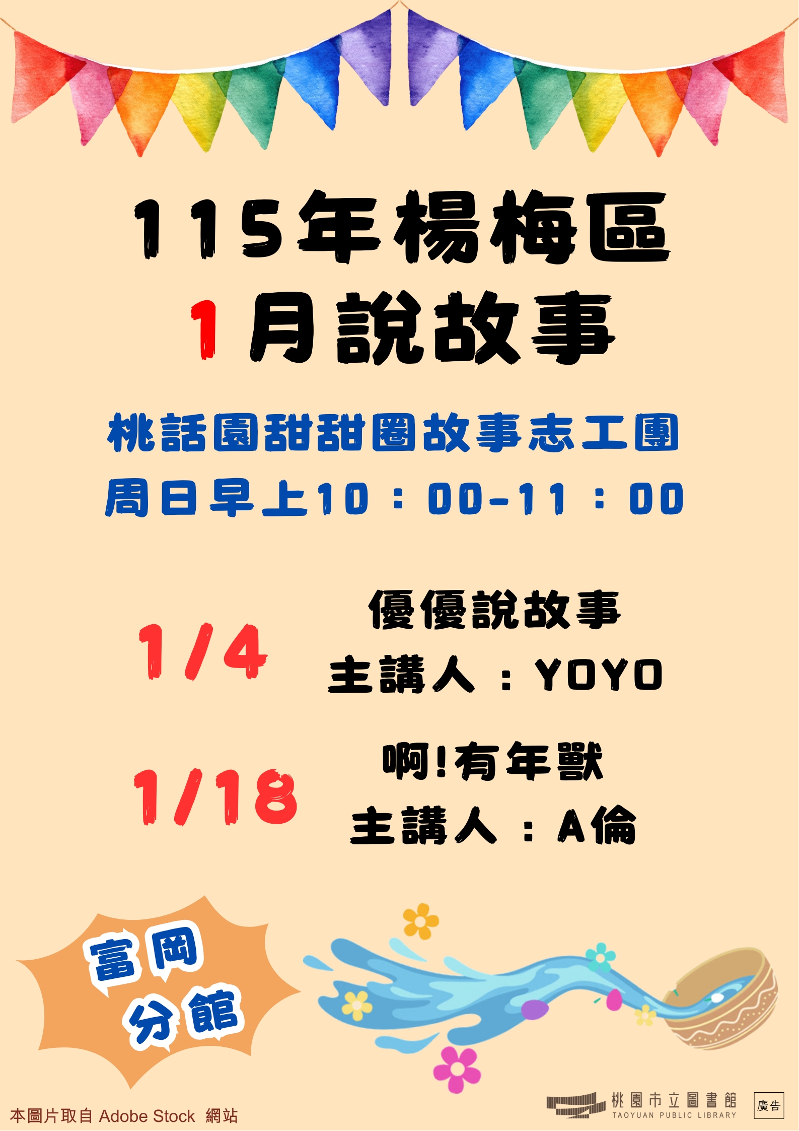 1.活動簡介: 由故事志工團體藉由說故事及延伸活動,帶領進入閱讀世界。2.活動時間: 週日上午10:00-11:003.主講團隊: 桃話園甜甜圈故事志工團4.活動地點: 富岡分館1樓兒童區5.活動場次:1/04«優優說繪本» /YOYO1/18«啊!有年獸» /A倫 ※ 免費自由入場,無需報名