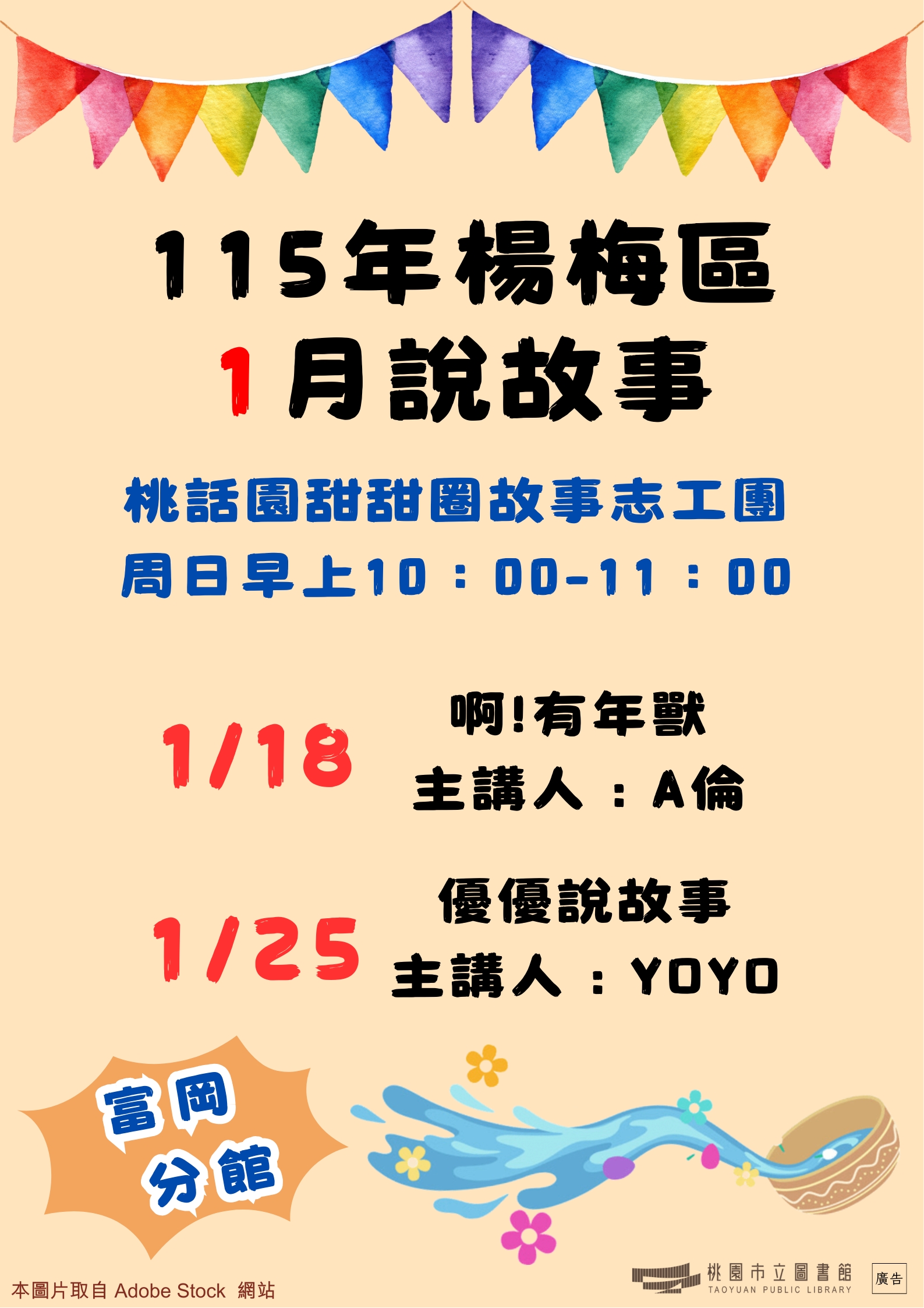 1.活動簡介: 由故事志工團體藉由說故事及延伸活動,帶領進入閱讀世界。2.活動時間: 週日上午10:00-11:003.主講團隊: 桃話園甜甜圈故事志工團4.活動地點: 富岡分館1樓兒童區5.活動場次:1/18«啊!有年獸» /A倫1/25«優優說繪本» /YOYO 老師 (原1/4 說故事場次修改為1/25)※ 免費自由入場,無需報名