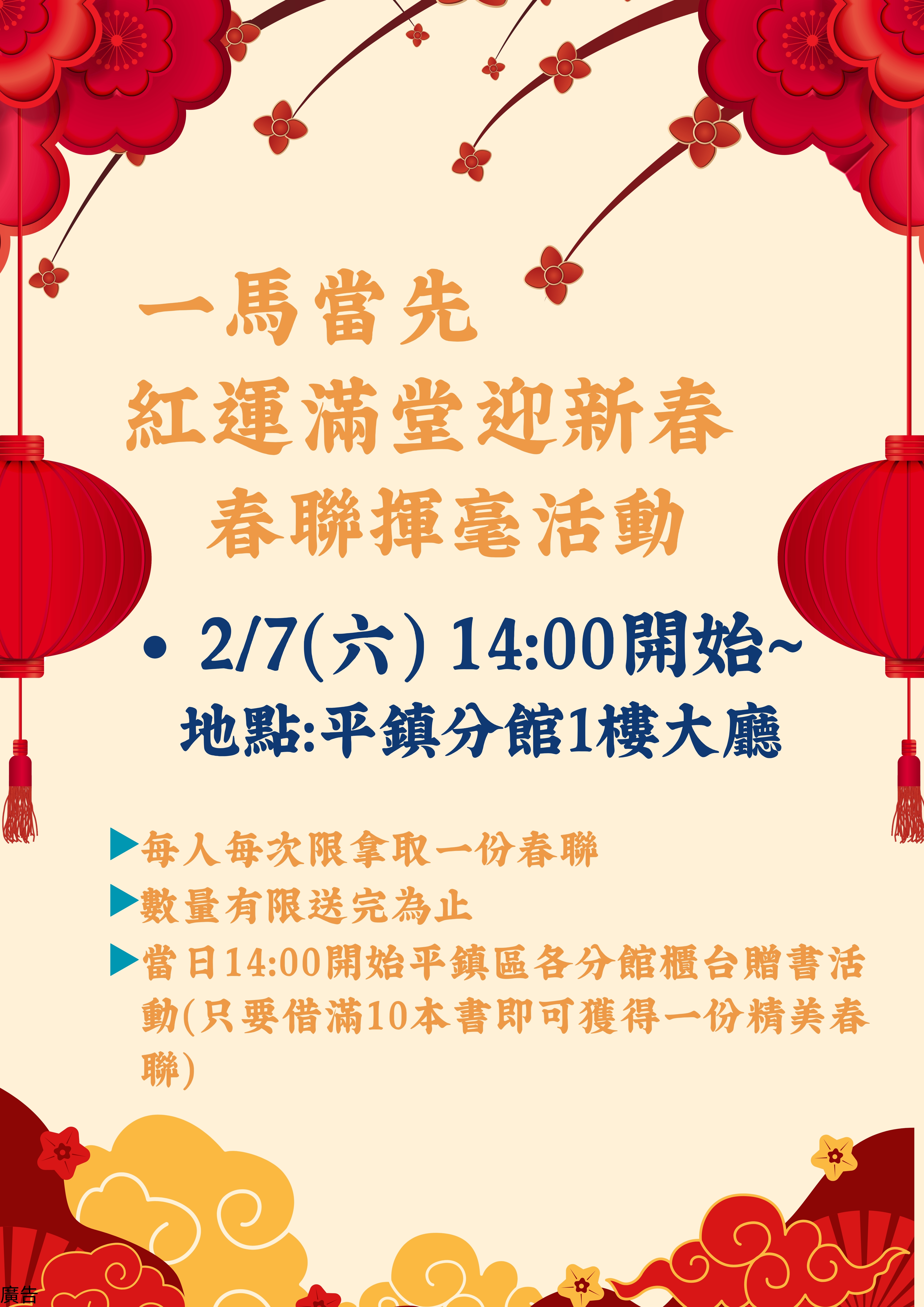📌平鎮分館春聯揮毫活動⏰時間:115年2月7日(六)14:00~開始🏠地點:平鎮分館1樓大廳(平鎮區環南路3段88號)❤️當日下午14:00開始,平鎮區各分館櫃台贈書活動,凡借閱書籍滿10本以上,即可獲得一份精美春聯喔~