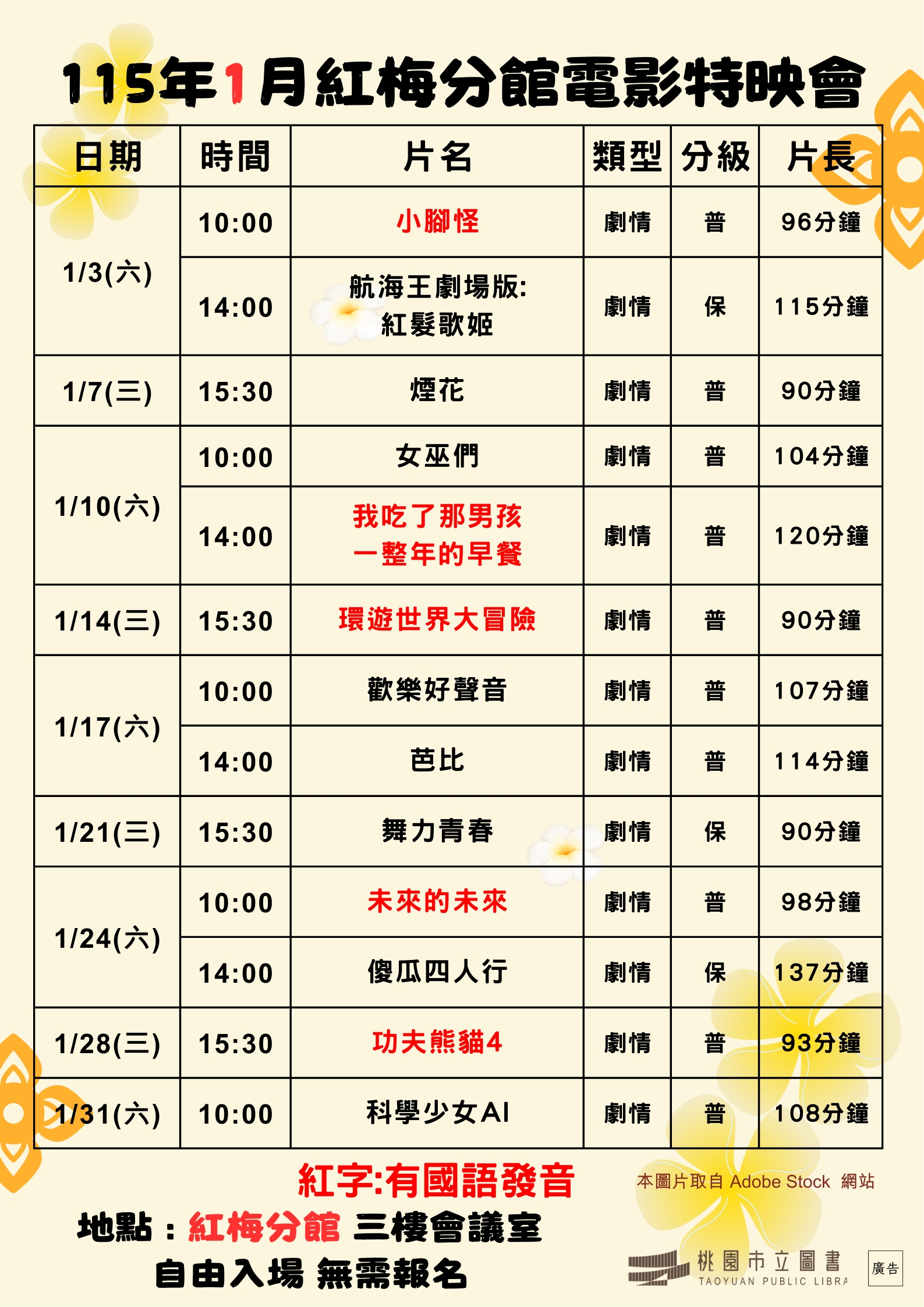 號外號外!!楊梅區電影院好評不斷,特映會加碼放映!!!歡迎每位大朋友小朋友一起來觀賞本館精心挑選的絕世好片~~1/3起,將在每週三下午15:30 每週六早上10:00及下午14:00播映(以公告電影時刻表為準) ※播映地點:紅梅分館3樓會議室※電影時刻表: