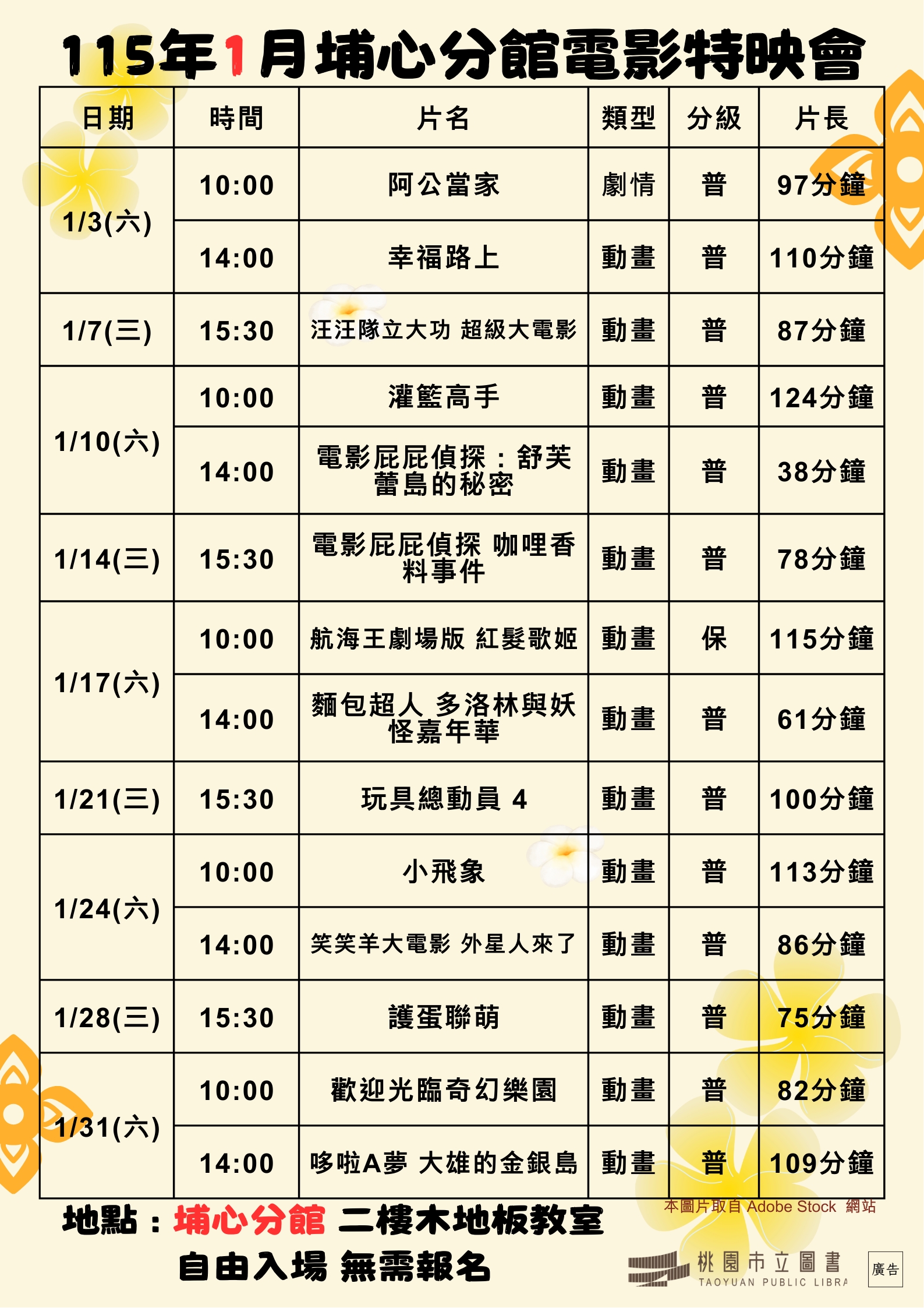 號外號外!!楊梅區電影院好評不斷,特映會加碼放映!!!歡迎每位大朋友小朋友一起來觀賞本館精心挑選的絕世好片~~1/3起,將在每週三下午15:30 每週六早上10:00及下午14:00播映(以公告電影時刻表為準) ※播映地點:埔心分館2樓研習教室※電影時刻表: