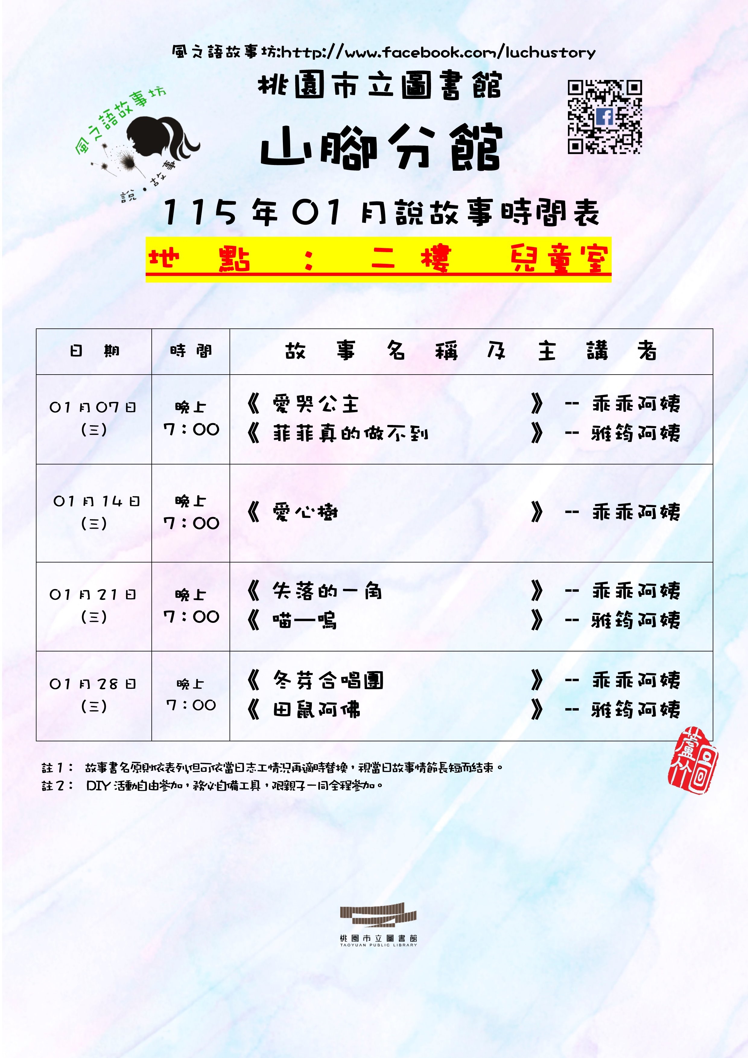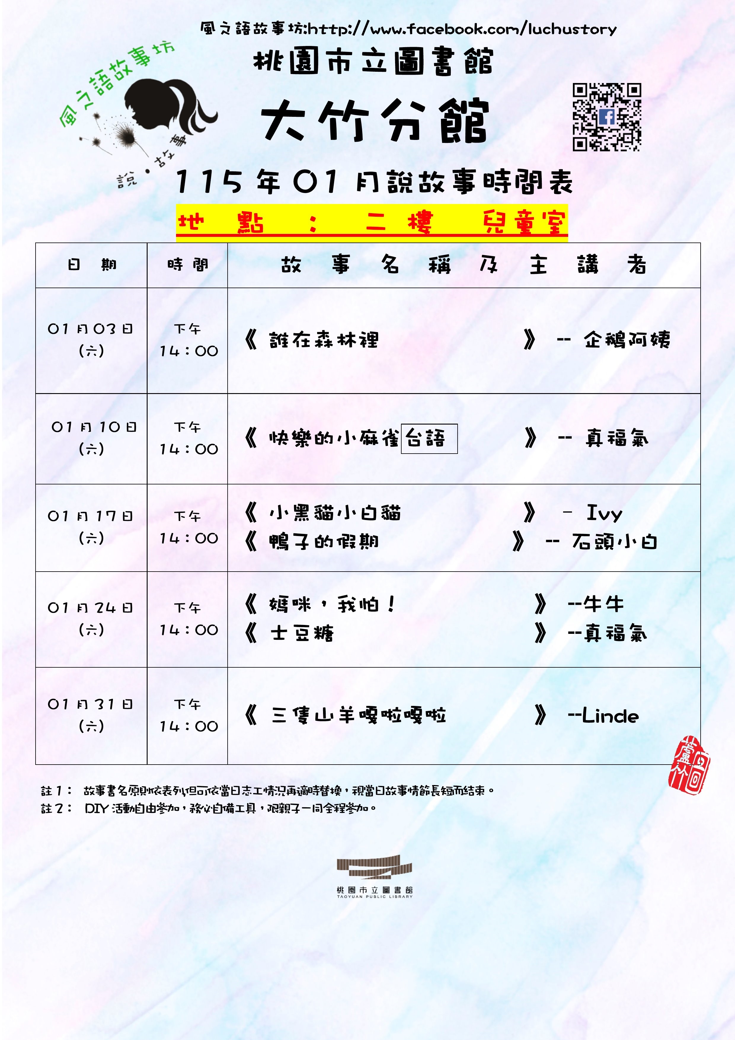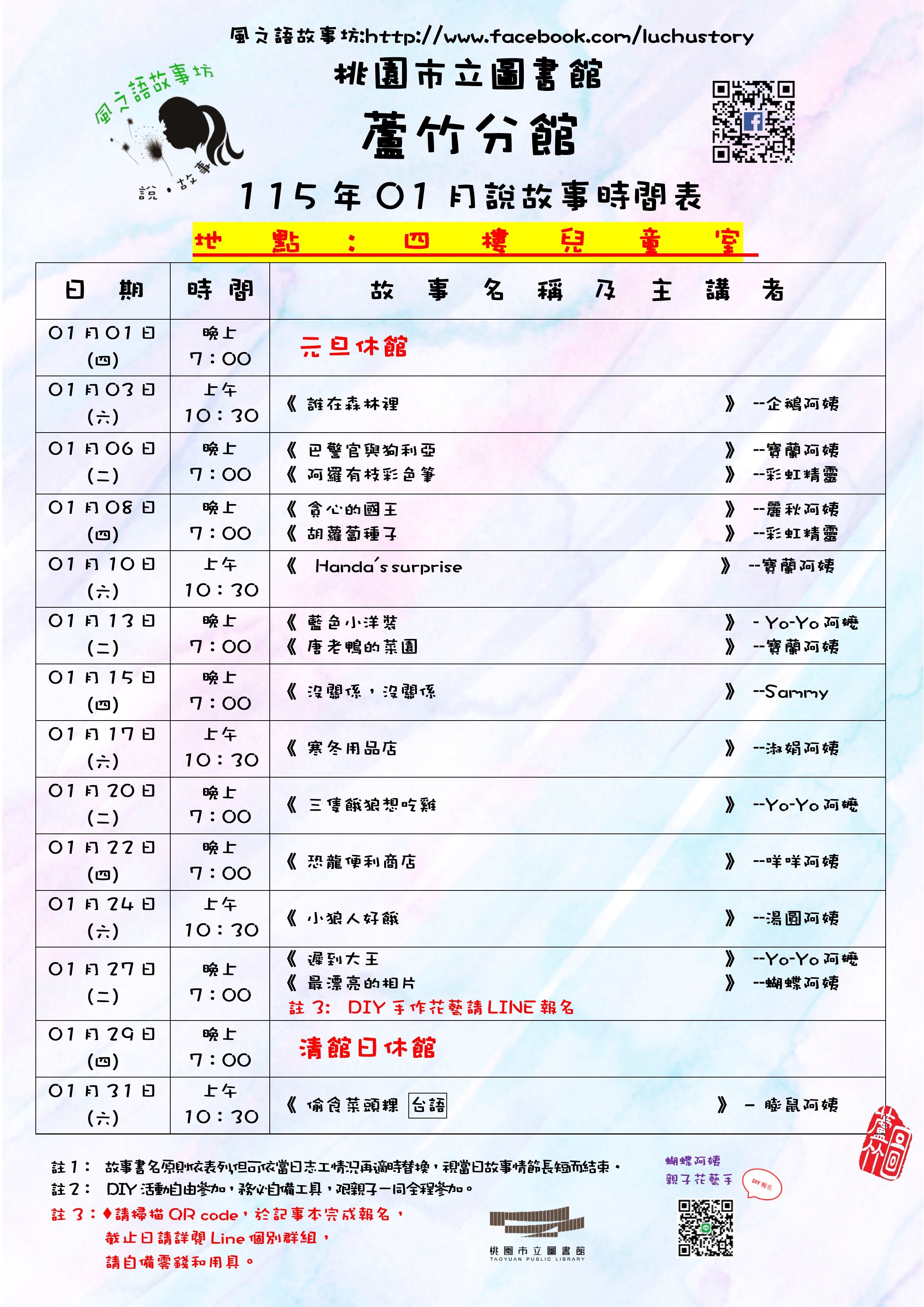 活動簡介: 由故事志工團體風之語故事坊的成員藉由說故事、美勞DIY、話劇表演等活動,引領孩子們進入繪本的世界裡。主講人:風之語故事坊蘆竹分館4樓兒童室活動時間:每週二、四 19:00-20:00、每週六 10:30-11:3003-3526811大竹分館兒童室活動時間:每週六 14:00-15:0003-3138034山腳分館兒童室活動時間:每週三 19:00-20:0003-3241325