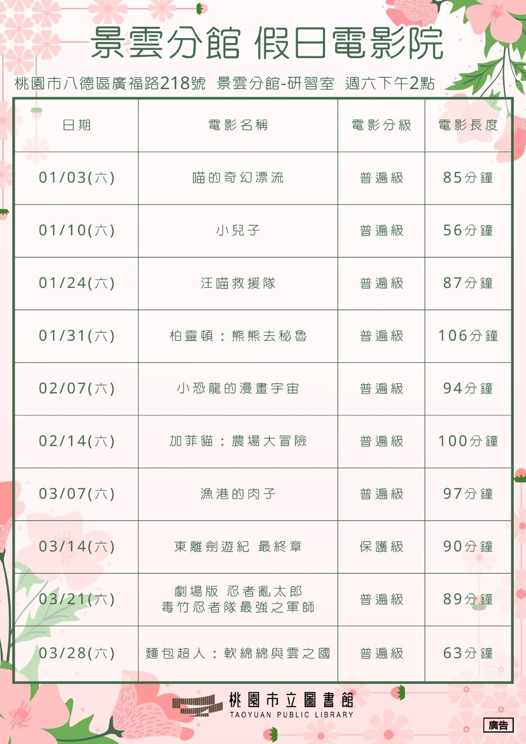 【景雲分館】假日電影院|親子共賞電影好時光景雲分館假日電影院,邀請您和孩子一起,用電影開啟美好的週末午後。精選適合親子欣賞的動畫與家庭電影,讓閱讀空間也充滿影像的想像力。📍 地點:景雲分館 研習室🕑 時間:每週六 下午 2 點🎥 播放內容:依月份規劃不同主題電影,陪伴孩子在故事中學習、感受與成長。歡迎親子同行、自由入場,讓圖書館成為全家共享回憶的地方。✅ 提醒:建議提早到場入座如遇特殊情形,請以現場公告為準