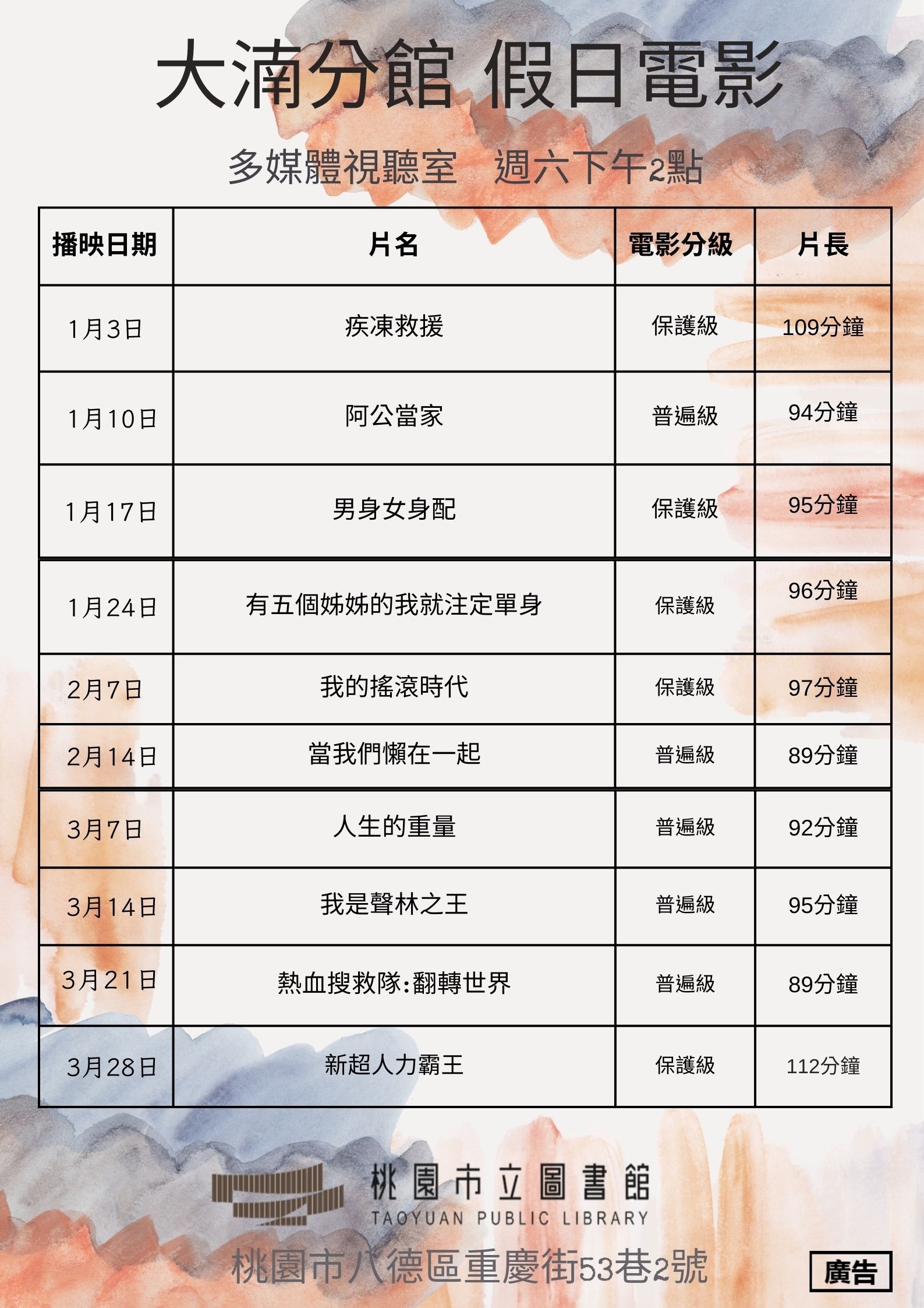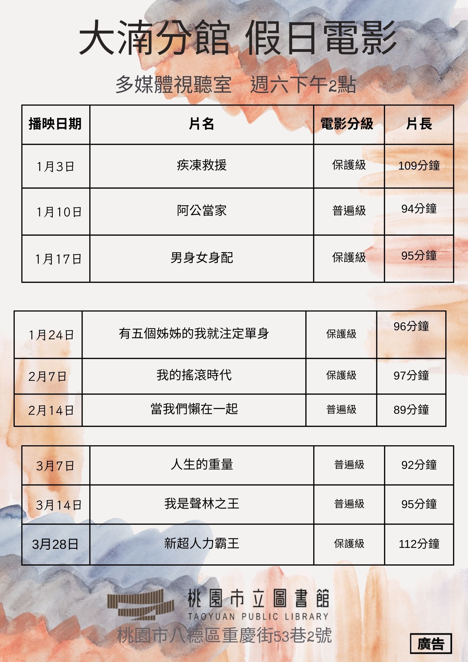 【大湳分館】假日電影欣賞活動|邀您週六午後一起看電影大湳分館假日電影時光開播囉!精選多部電影,陪伴讀者在週六午後放慢腳步,享受影像帶來的故事力量。📍 地點:大湳分館 多媒體視聽室🕑 時間:每週六 下午 2 點🎞️ 內容:依時程播放不同主題電影歡迎親子家庭、一般讀者自由入場,一起在圖書館度過充實又溫暖的假日時光。✅ 提醒:請留意電影分級,建議家長陪同觀影;座位有限,請提早入場。如遇特殊情形,請以現場公告為準。