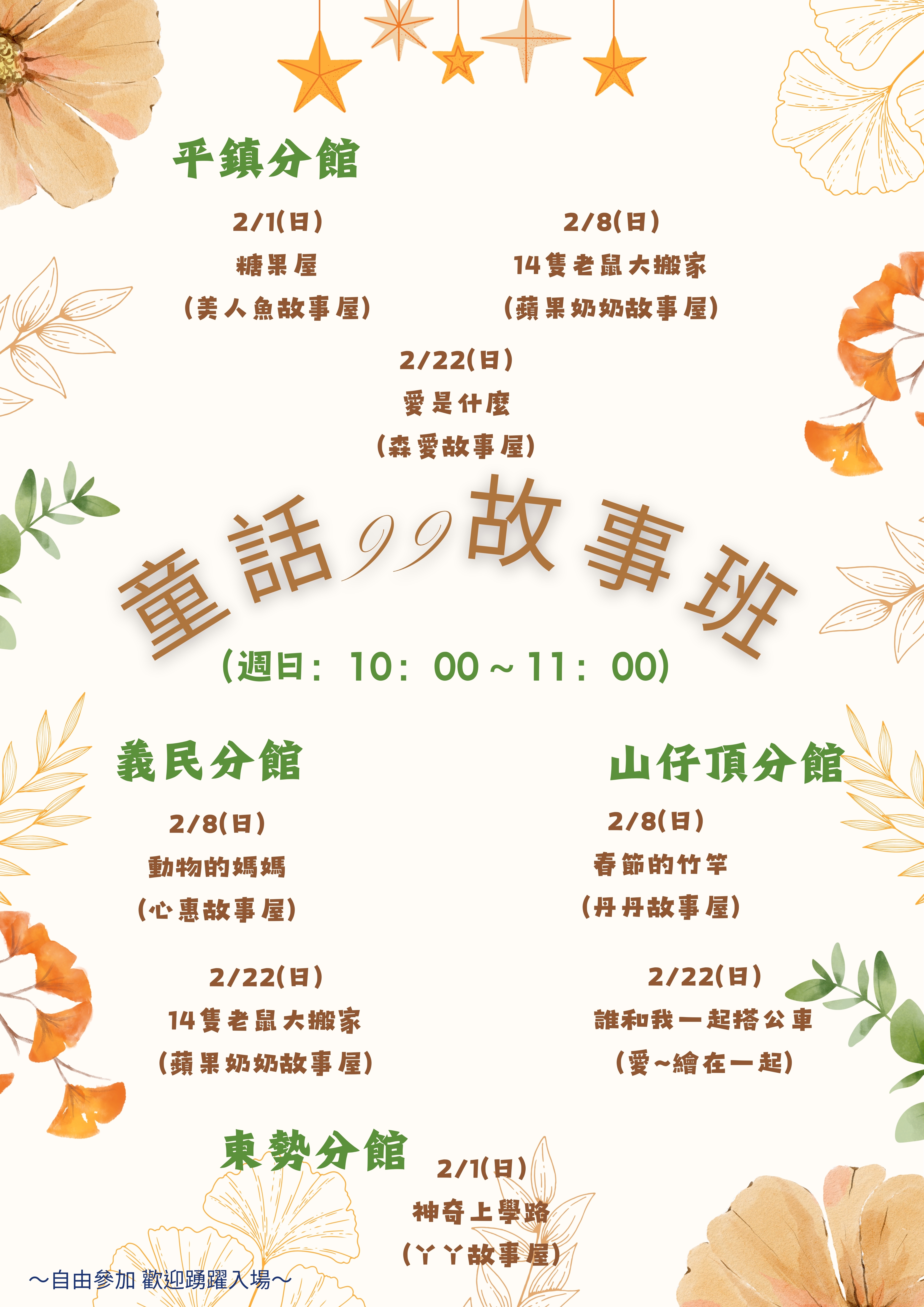 館別日期故事屋名稱演說繪本平鎮分館2/1美人魚故事屋糖果屋2/8蘋果奶奶故事屋14隻老鼠大搬家2/22森愛故事屋愛是什麼山仔頂分館2/8丹丹故事屋春節的竹竿2/22愛~繪在一起誰和我一起搭公車東勢分館2/1丫丫故事屋神奇上學路義民分館2/8心惠故事屋動物的媽媽2/22蘋果奶奶故事屋14隻老鼠大搬家