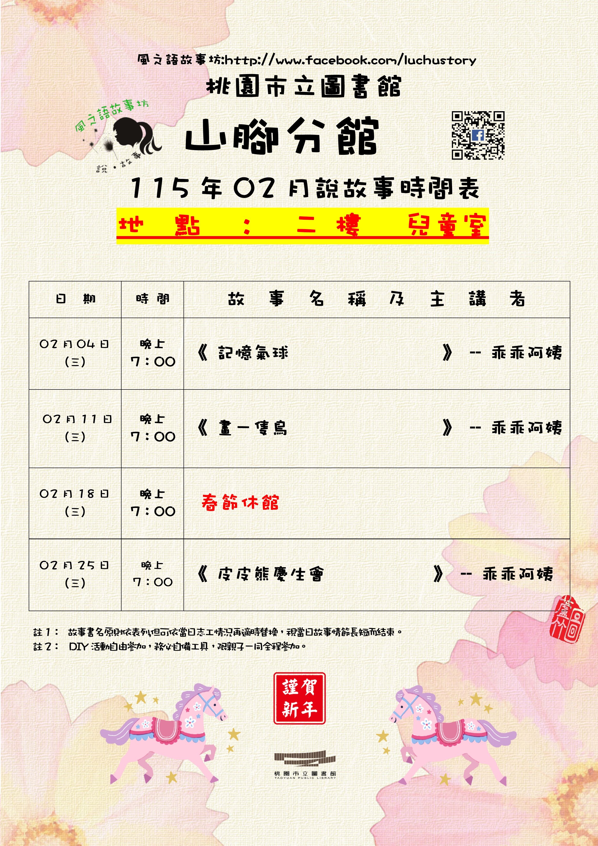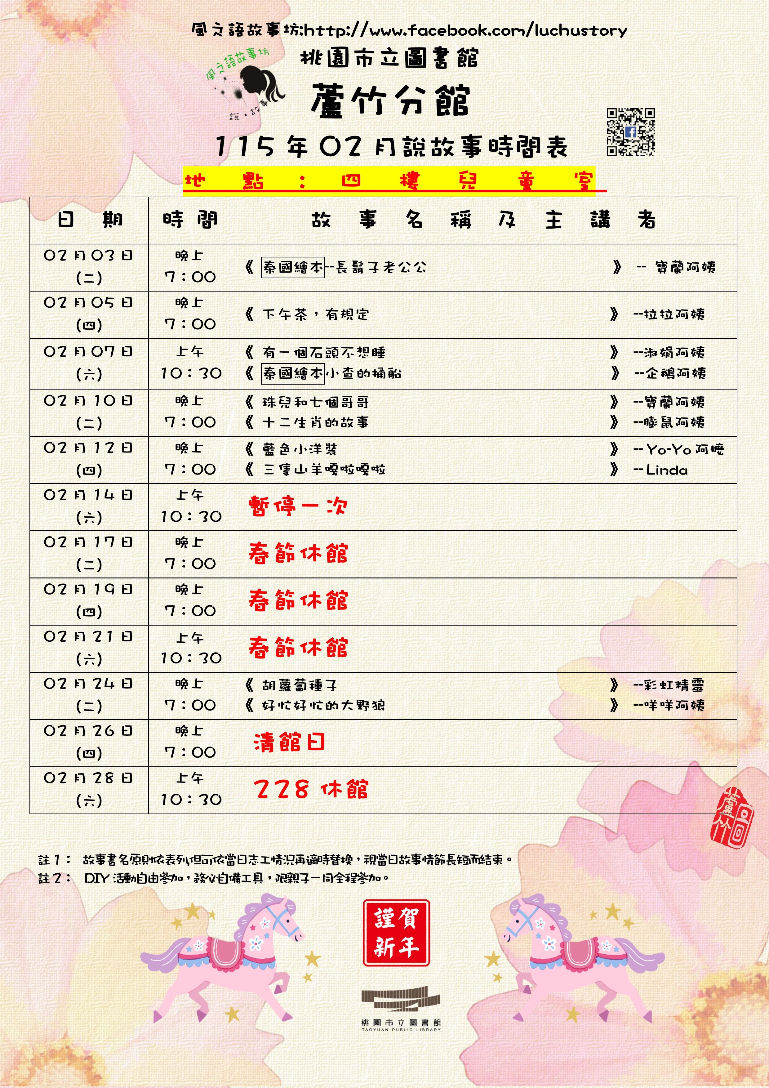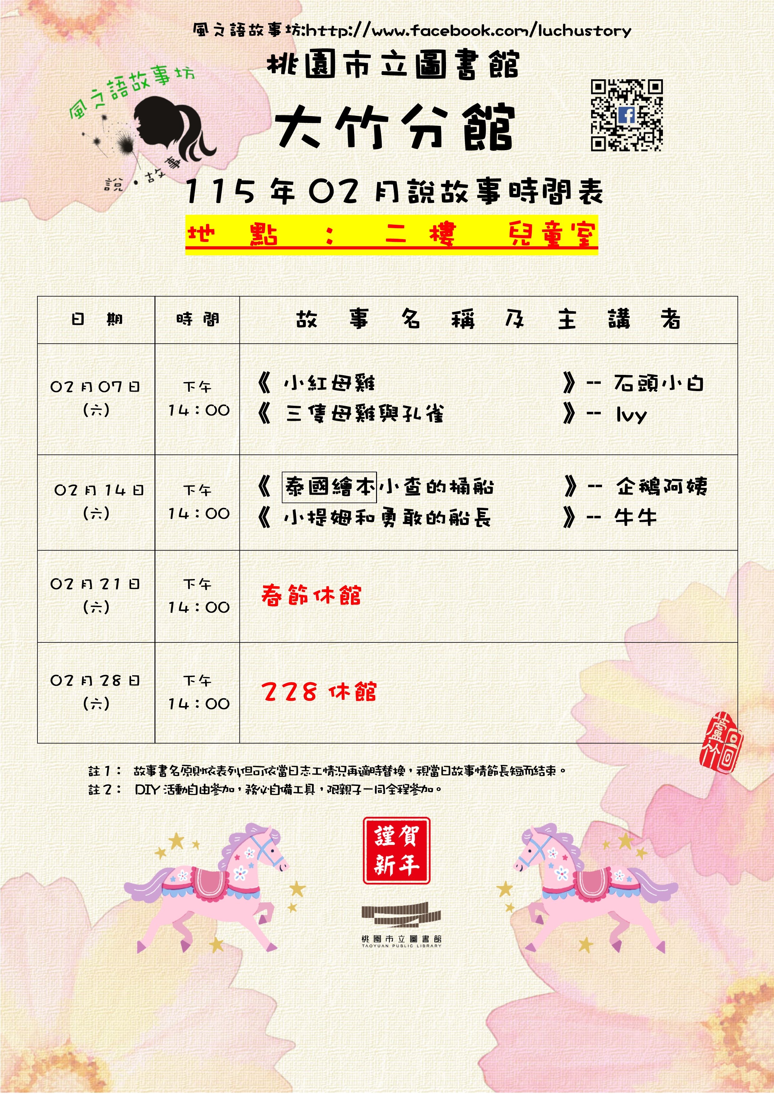 活動簡介: 由故事志工團體風之語故事坊的成員藉由說故事、美勞DIY、話劇表演等活動,引領孩子們進入繪本的世界裡。主講人:風之語故事坊蘆竹分館4樓兒童室活動時間:每週二、四 19:00-20:00、每週六 10:30-11:3003-3526811大竹分館兒童室活動時間:每週六 14:00-15:0003-3138034山腳分館兒童室活動時間:每週三 19:00-20:0003-3241325