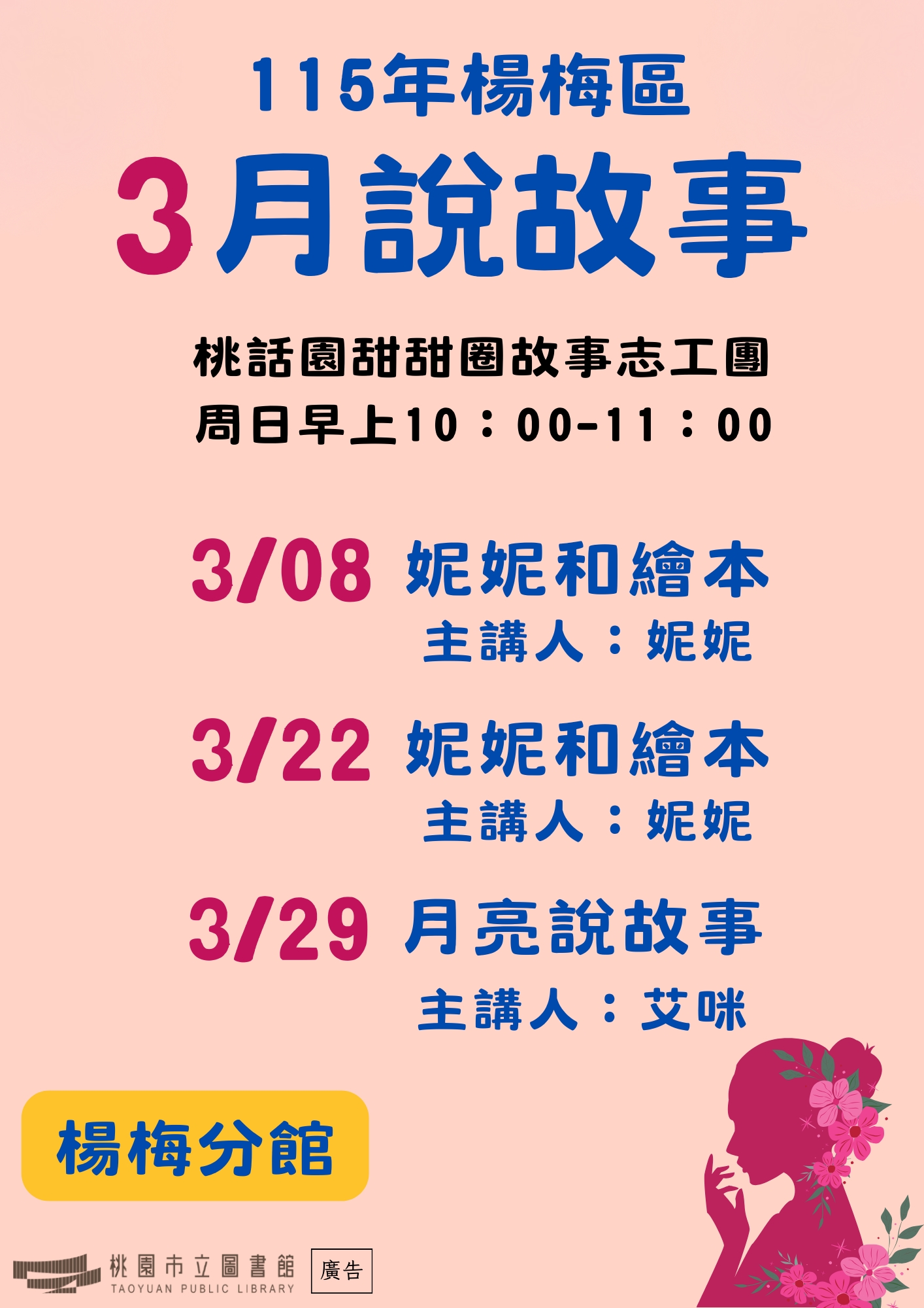 1.活動簡介: 由故事志工團體藉由說故事及延伸活動,帶領進入閱讀世界。2.活動時間: 週日上午10:00-11:003.主講團隊: 桃話園甜甜圈故事志工團4.活動地點: 楊梅分館1樓兒童區5.活動場次:3/08«妮妮和繪本» /妮妮3/22«妮妮和繪本» /妮妮3/29«月亮說故事» /艾咪※ 免費自由入場,無需報名