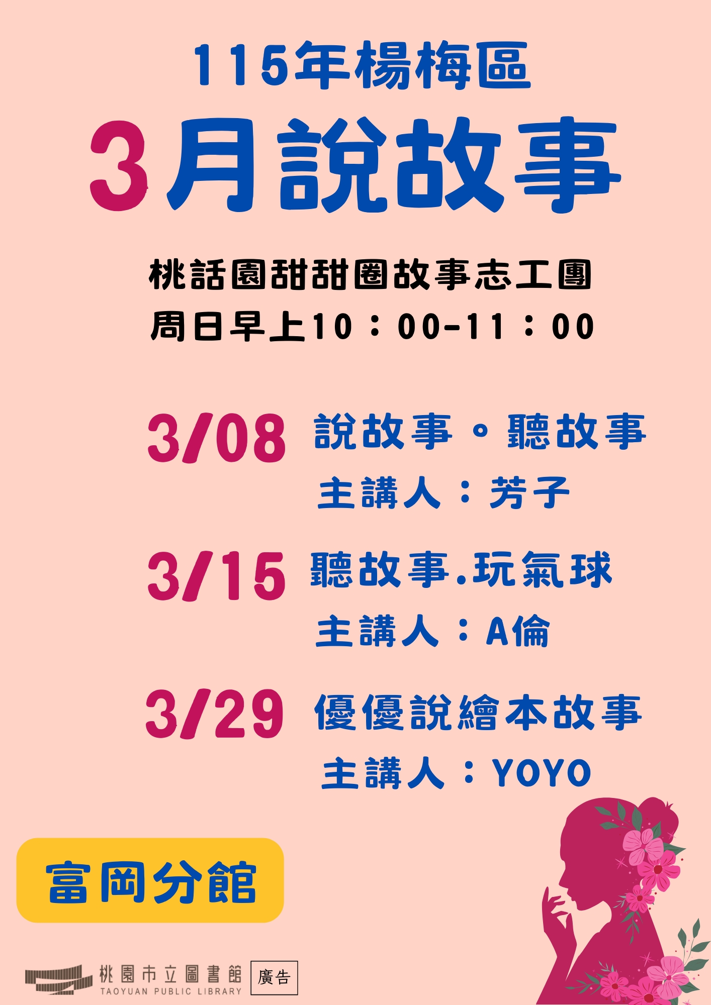 1.活動簡介: 由故事志工團體藉由說故事及延伸活動,帶領進入閱讀世界。2.活動時間: 週日上午10:00-11:003.主講團隊: 桃話園甜甜圈故事志工團4.活動地點: 富岡分館1樓兒童室5.活動場次:3/08«說故事。聽故事» /芳子3/15«聽故事.玩氣球» /A倫3/29«優優說繪本故事» /YOYO※ 免費自由入場,無需報名