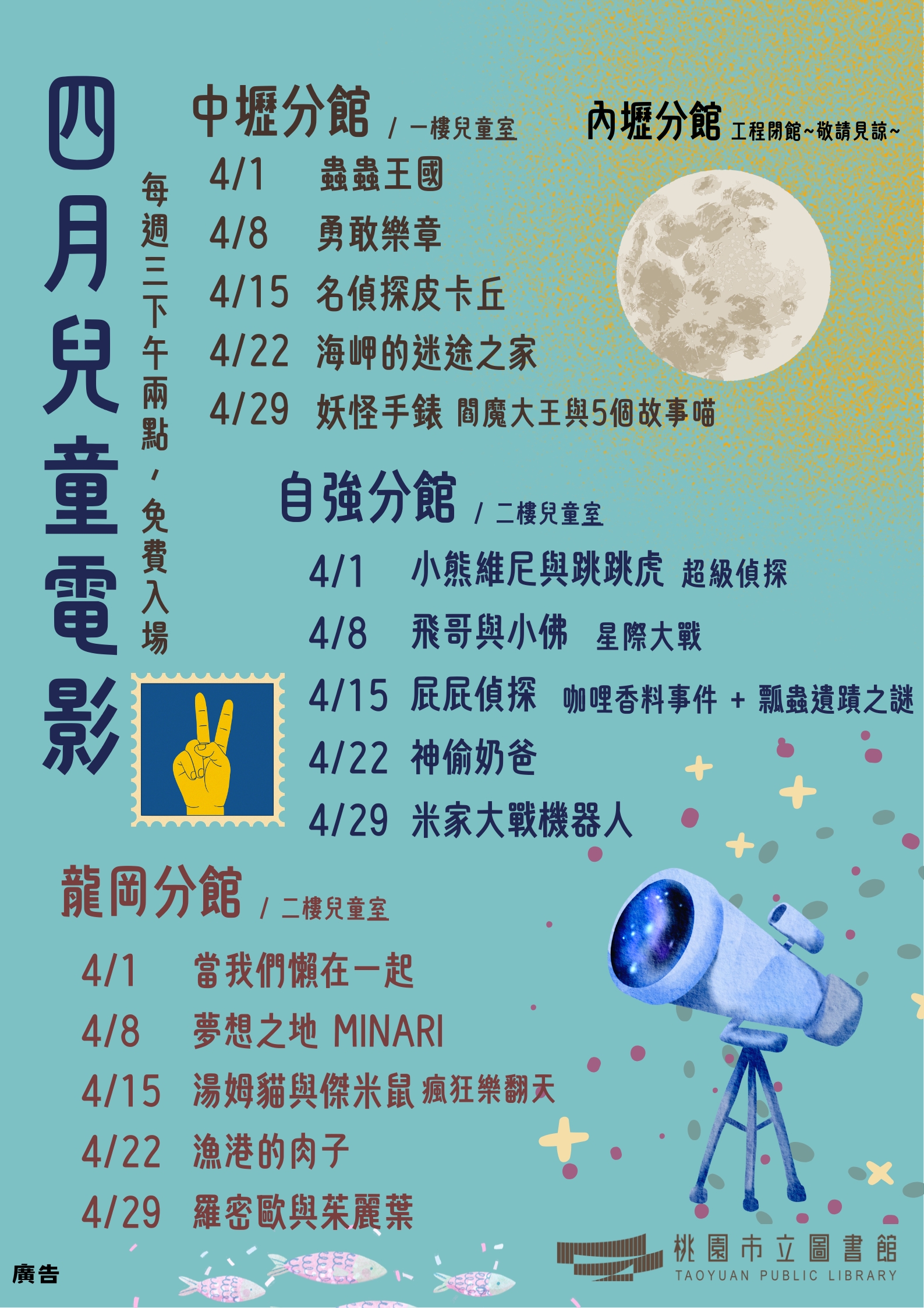 內壢分館近期工程閉館-電影播放取消,敬請見諒。