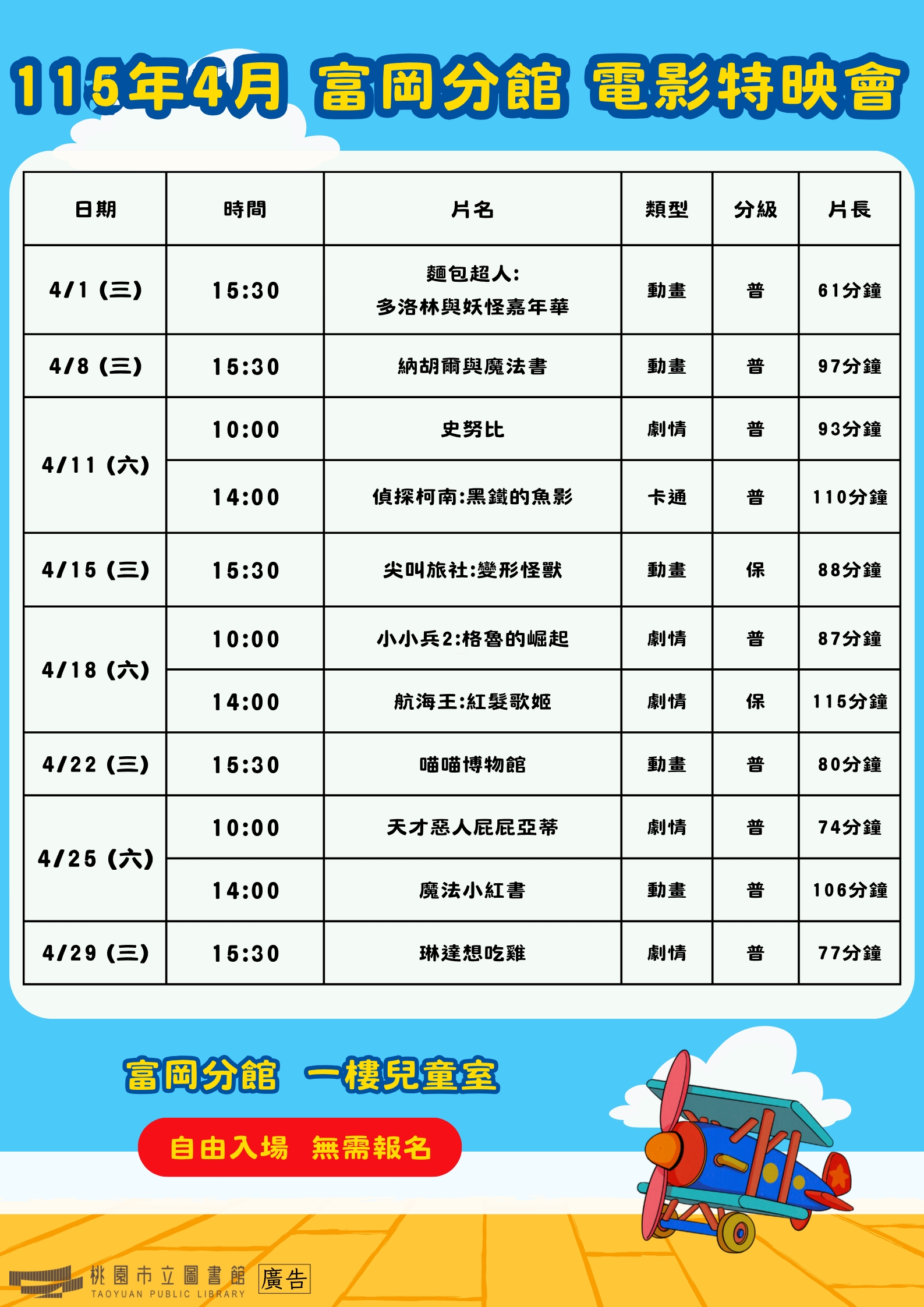 號外號外!!楊梅區電影院好評不斷,特映會加碼放映!!!歡迎每位大朋友小朋友一起來觀賞本館精心挑選的絕世好片~~4/1起,將在每週三下午15:30 每週六早上10:00及下午14:00播映(以公告電影時刻表為準) ※播映地點:富岡分館1樓兒童室※電影時刻表: