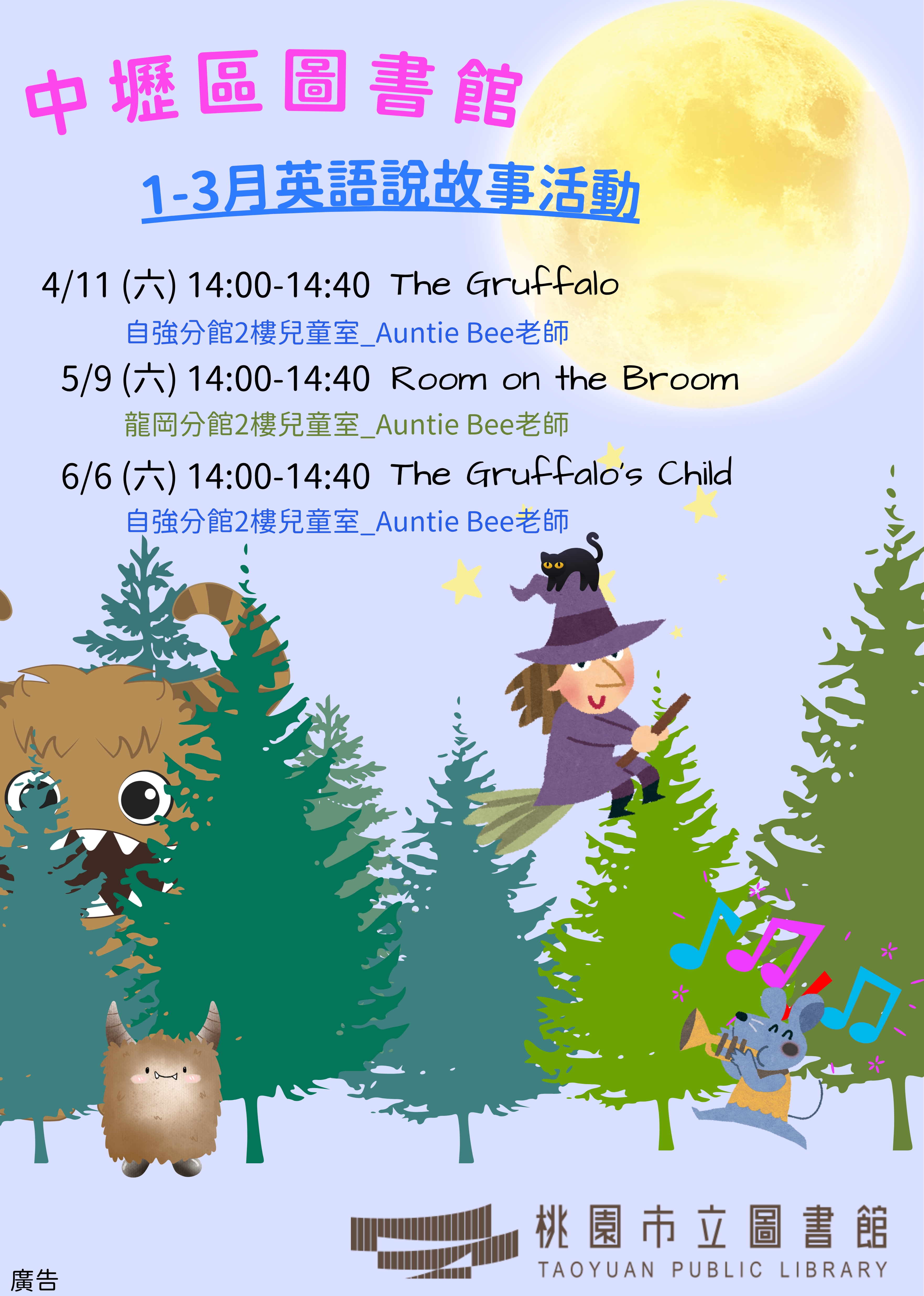 4/11(六)14:00~14:40自強分館2樓兒童室Auntie Bee老師 ----【The Gruffalo】5/9(六)14:00~14:40龍岡分館2樓兒童室Auntie Bee老師 ----【Room on the Broom】6/6(六)14:00~14:40自強分館2樓兒童室Auntie Bee老師 ----【The Gruffalo's Child】 以上活動皆自由入場,無須報名
