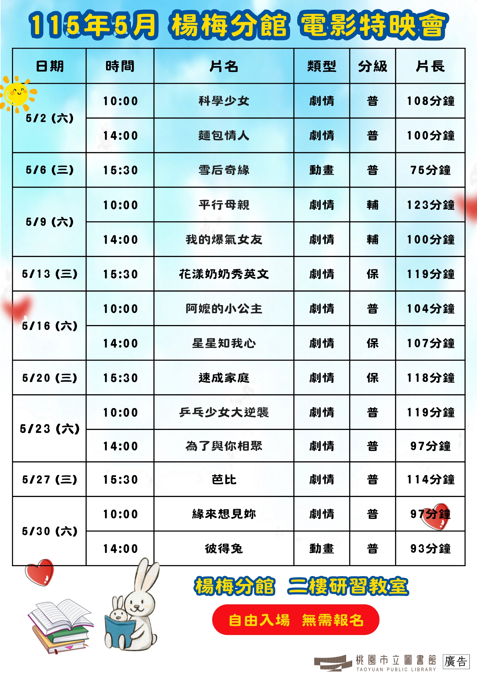 號外號外!!楊梅區電影院好評不斷,特映會加碼放映!!!歡迎每位大朋友小朋友一起來觀賞本館精心挑選的絕世好片~~5/2起,將在每週三下午15:30 每週六早上10:00及下午14:00播映(以公告電影時刻表為準) ※播映地點:楊梅分館2樓研習教室※電影時刻表: