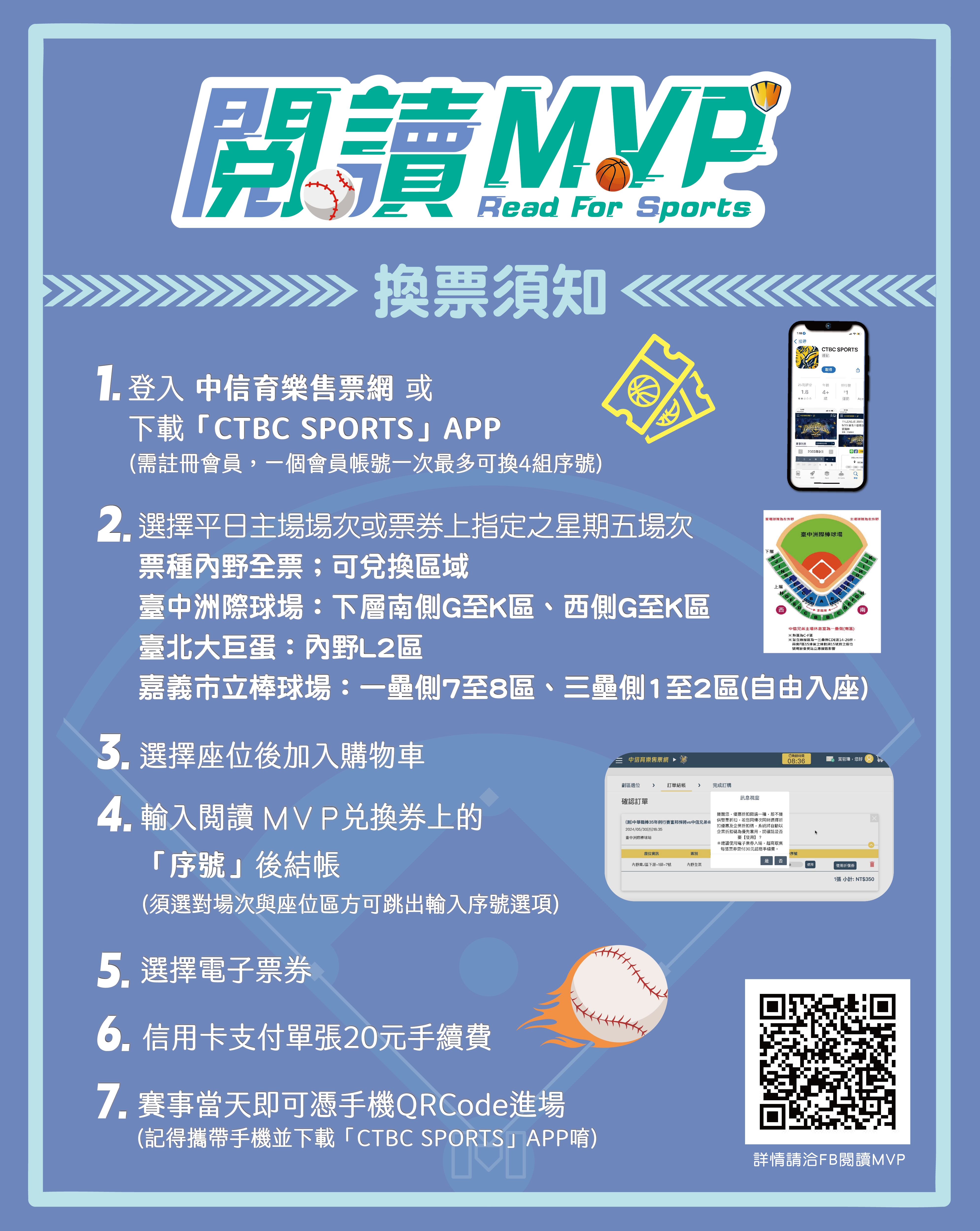 活動時間:4月21日至5月17日止,可於基隆市、臺北市、新北市、桃園市、嘉義市、嘉義縣、臺南市、高雄市有合作的縣市公立圖書館參加活動,完成借書或點數兌換任務後,掃描書展區或櫃檯桌牌的QR Code填寫線上問卷、按讚閱讀MVP粉專,並撰寫50字以上心得,即可獲得一張「2026閱讀MVP-中信兄弟平日主場門票兌換序號」,憑個人借書證每人限兌換乙張,不得重複兌換。