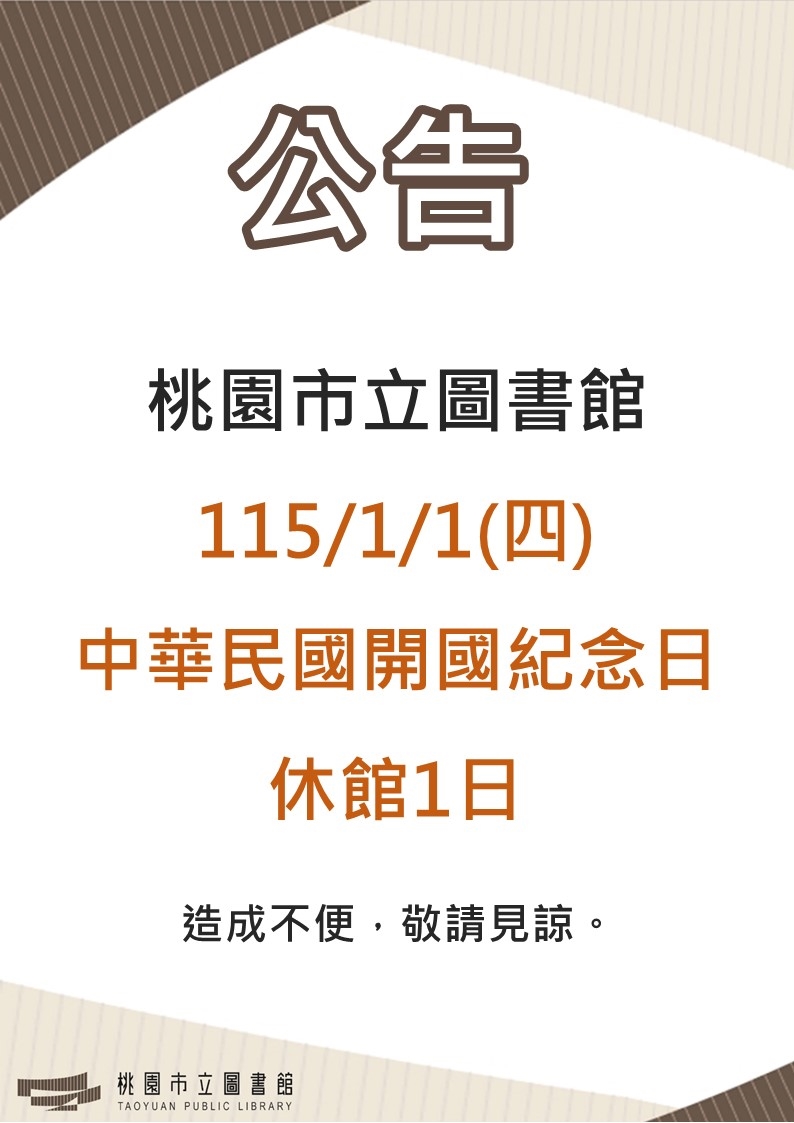 【桃園市立圖書館 中華民國開國紀念日休館1日】