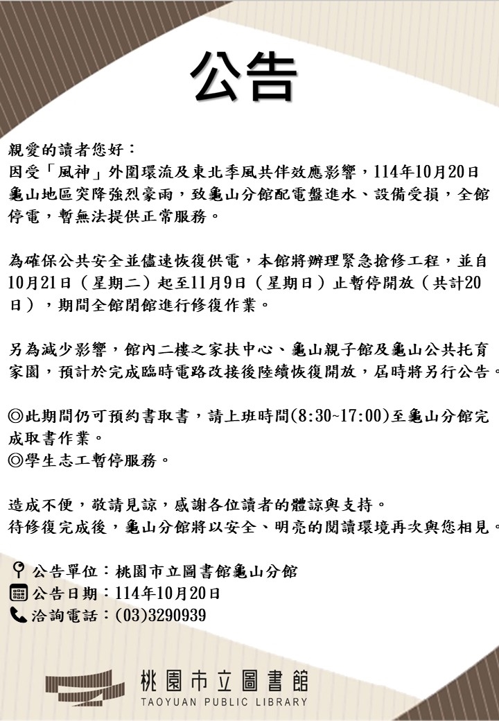 因受「風神」外圍環流及東北季風共伴效應影響,114年10月20日龜山地區突降強烈豪雨,致龜山分館配電盤進水、設備受損,全館停電,暫無法提供正常服務。